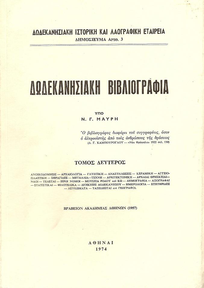 ΜΑΥΡΗΣ ΝΙΚ., Δωδεκανησιακή βιβλιογραφία. Τόμοι 1-2. Αθήναι 1965,1974, 8ο, σελ. ξγ΄+1λ+323+ ιε΄+1λ+252+1λ+1χ.α+2λ (τόμ. Α΄: ΒΙΒΛΙΟΓΡΑΦΙΑΙ-ΒΙΒΛΙΟΘΗΚΑΙ-ΓΕΝΙΚΑΙ ΠΡΑΓΜΑΤΕΙΑΙ-ΓΕΩΛΟΓΙΑ-ΧΛΩΡΙΣ- ΠΑΝΙΣ-ΕΚΚΛΗΣΙΑ-ΛΑΟΓΡΑΦΙΑ-ΓΛΩΣΣΟΛΟΓΙΑ-ΤΟΠΩΝΥΜΙΑ-ΕΚΠΑΙΔΕΥΣΙΣ-ΙΑΤΡΙΚΑ-ΝΟΜΙΚΑ-ΟΙΚΟΝΟΜΙΑ, τόμ.Β΄: ΑΝΟΙΚΟΔΟΜΗΣΙΣ-ΑΡΧΑΙΟΛΟΓΙΑ-ΓΛΥΠΤΙΚΗ-ΑΝΑΣΤΗΛΩΣΕΙΣ-ΚΕΡΑΜΙΚΗ-ΑΓΓΕΙΟΠΛΑΣΤΙΚΗ-ΣΦΡΑΓΙΔΕΣ-ΜΕΤΑΛΛΙΑ-ΤΕΧΝΗ-ΑΡΧΙΤΕΚΤΟΝΙΚΗ-ΑΡΧΑΙΑΙ ΘΡΗΣΚΕΙΑΙ-ΝΑΟΙ-ΤΕΛΕΤΑΙ-ΙΕΡΟΙ ΝΟΜΟΙ-ΜΟΥΣΕΙΑ ΡΟΔΟΥ και ΚΩ-ΔΗΜΟΓΡΑΦΙΑ-ΑΠΟΓΡΑΦΑΙ-ΣΤΑΤΙΣΤΙΚΑΙ-ΦΙΛΟΤΕΛΙΚΑ-ΔΙΟΙΚΗΣΙΣ ΔΩΔΕΚΑΝΗΣΟΥ-ΗΜΕΡΟΛΟΓΙΑ-ΕΠΕΤΗΡΙΔΕΣ-ΛΕΥΚΩΜΑΤΑ-ΤΑΞΕΙΔΙΩΤΑΙ και ΓΕΩΓΡΑΦΟΙ. Στο Α΄τόμο αφιέρωση του συγγραφέα)