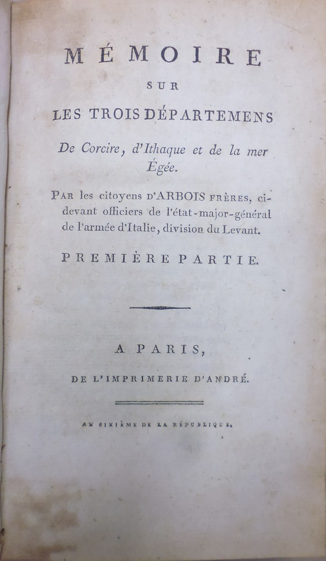 STEPHANOPOLI  DEMO ET NICOLO, Voyage en Grèce, pendant les années 1797 et 1798, t. 1-2. D’après deux missions, dont l’une du Gouvernement français, et l’autre du général  en chef Buonaparte. Rédigé par un des Professeurs du Prytanée. Avec figures, plans et vues levés sur les lieux. A Londres 1800, 8ο, τόμος Α΄ σελ. XVI+303+7εικ. εκτός κειμένου(εκ των οποίων οι 2 αναδιπλούμενες) , τόμος Β΄ σ. 4χ.α.+319+1λ. ( 2 τόμοι δεμένοι, βιβλιοδεσία εποχής. Στον πρώτο τόμο μπροστά δεμένο μαζί : Mémoire sur les trois départemens De Corcire, d’Ithaque et de la mer Egée Par les citoyens D’ ARBOIS FRERES, cidevant officiers de l’état-major-général de l’armée d’Italie, division du Levant part.1-2 . A Paris, DE L’ IMPRIMERIE D’ ANDRE. 1897, 8o, σελ. 104 (αντίτυπο σε πολύ καλή κατάσταση)