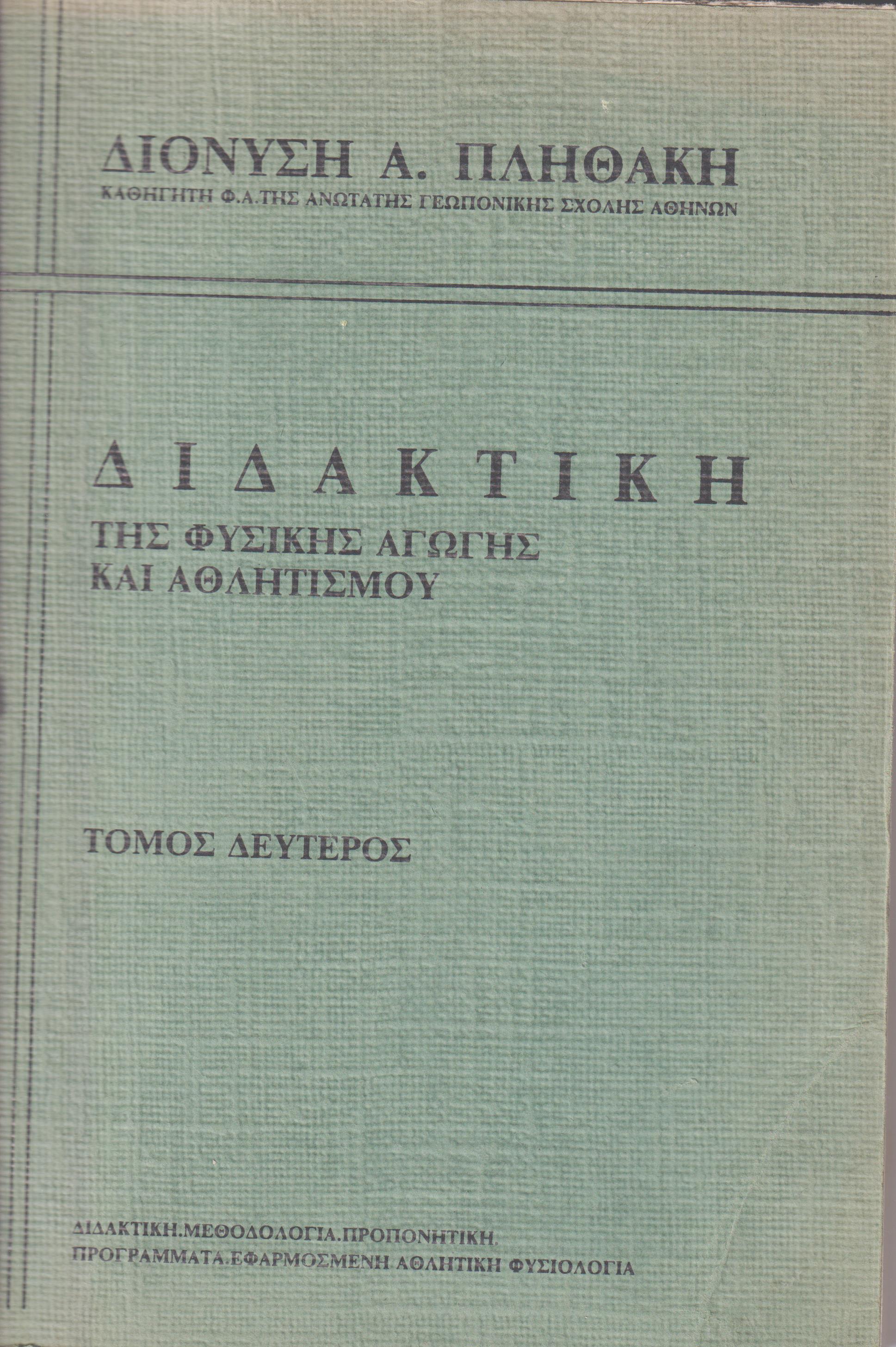 ΠΛΗΘΑΚΗΣ ΔΙΟΝΥΣΗΣ Α. , Διδακτική της φυσικής αγωγής και αθλητισμού. Τόμοι 1-2 . Αθήνα 1977, 8ο, σελ. 369+144 (Αθλητική παιδαγωγική, αθλητική αγωγή, αθλητική πολιτική), πολυγραφημένο
