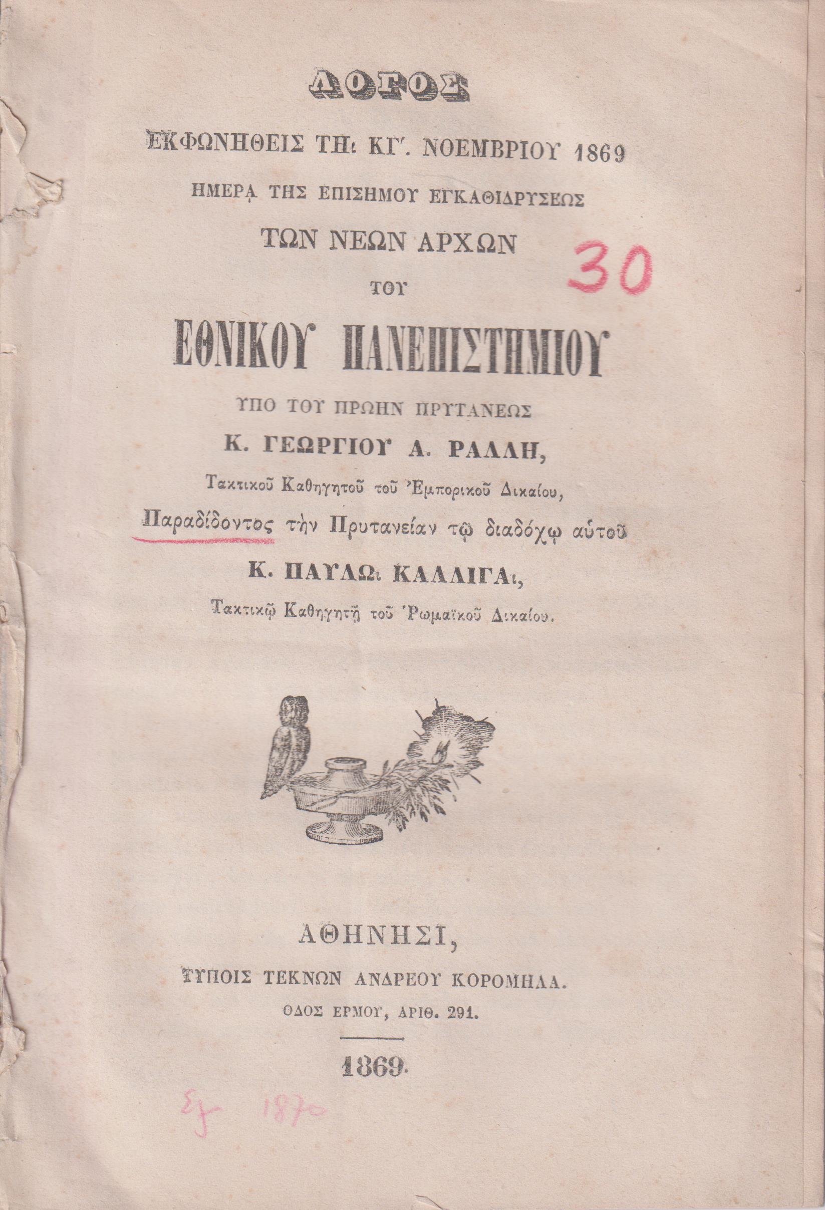 ΡΑΛΛΗΣ ΓΕΩΡΓΙΟΣ Α., Λόγος εκφωνηθείς τη ΚΓ΄ ΝΟΕΜΒΡΙΟΥ 1869 ημέρα της επισήμου εγκαθιδρύσεως των Νεων Αρχών του Εθνικού Πανεπιστημίου υπό του πρώην Πρυτάνεως Κ. Γ.Α.Ρ. Τακτικού Καθηγητού του Εμπορικού Δικαίου, Παραδίδοντος την Πρυτανείαν τω διαδόχω αυτού Κ. ΠΑΥΛΟΥ ΚΑΛΛΙΓΑ, Τακτικώ Καθηγητή του Ρωμαϊκού Δικαίου. Αθήνησι 1869, 8ο,σελ. 160+2πιν. ( απόδετο, χωρίς εξώφυλλο, ΗΛΙΟΥ-ΠΟΛΕΜΗ αρ.*1869)