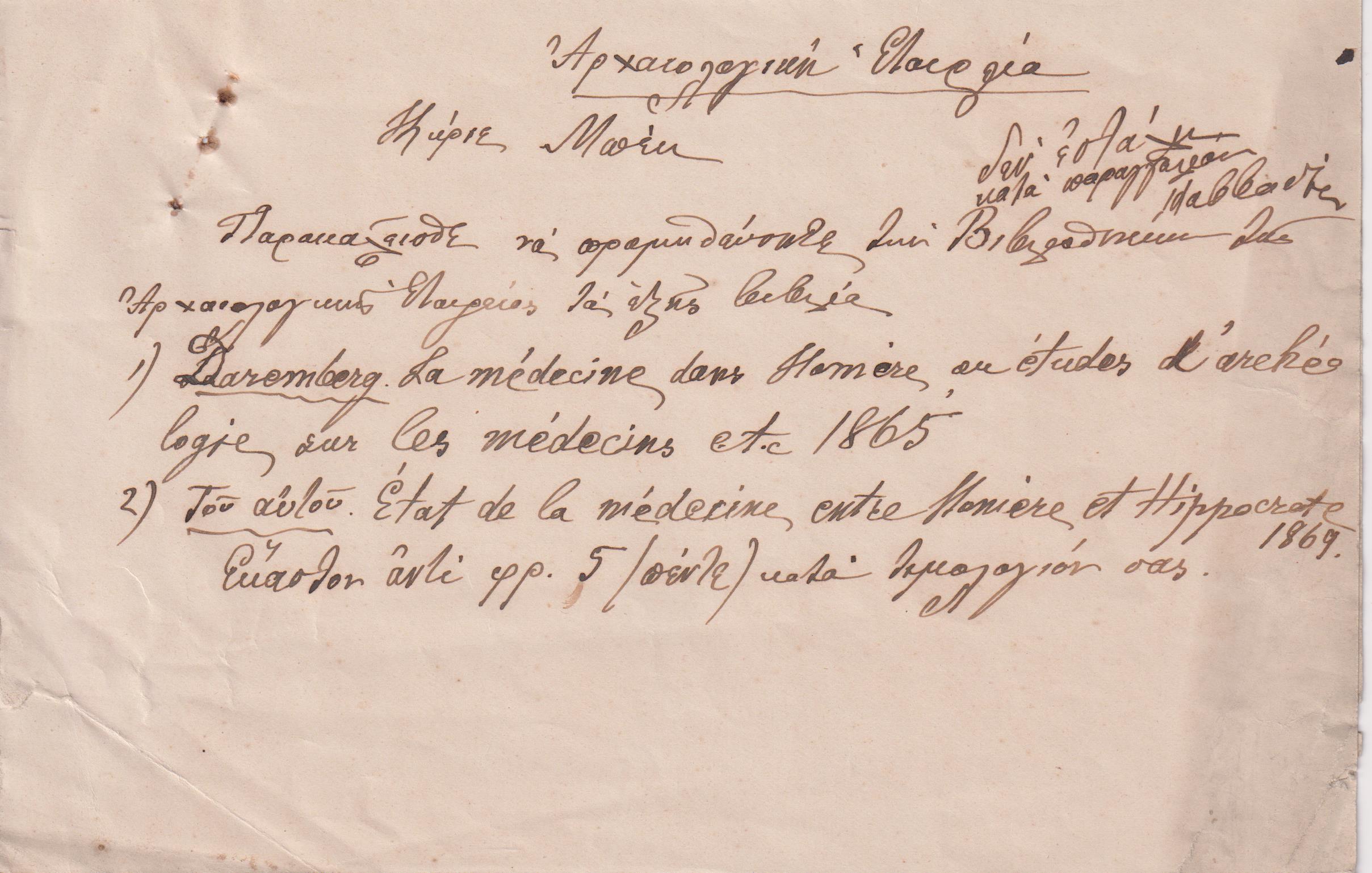 ΕΛΕΥΘΕΡΟΥΔΑΚΗΣ ΚΑΙ CHARLES BECK. Χειρόγραφα σημειώματα των διεθνών βιβλιοπωλείων Ελευθερουδάκη και Charles Beck για παραγγελίες βιβλίων από την Αρχαιολογική Εταιρεία. Αθήνα 10 Φεβρουαρίου 1902 και 21 Αυγούστου 1904. (Σύνολο 3 τεκμήρια)