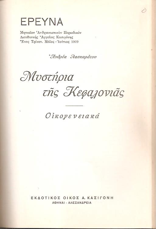 ΕΡΕΥΝΑ έτος Τρίτον [Ιαν.-Δεκ. 1929], Μηνιαίον Ανθρωπιστικόν Περιοδικόν. Δ/ντής ΄Αγγελος Κασιγόνης. Αθήναι-Αλεξάνδρεια, ΕΚΔΟΤΙΚΟΣ ΟΙΚΟΣ Α. ΚΑΣΙΓΟΝΗ, ΤΥΠΟΓΡΑΦΕΙΟΝ ΤΟΥ ΕΜΠΟΡΙΟΥ, 1929, 8ο, (ένας πανόδετος τόμος περιέχει τα παρακάτω έργα: [1] ΑΡΒΑΝΙΤΑΚΗ Γ. Λ., Επί τη εκατονταετηρίδι του Υψηλάντου, Μία εξομολόγησις του Αλεξάνδρου Υψηλάντου, [Ιανουάρ.], σελ. 31+1λ. [2] ΕΛΕΟΠΟΥΛΟΥ ΚΑΛΛΙΡΟΗΣ, Καθηγητρίας, Ο σύγχρονος πολιτισμός και η εκπαίδευσις, [Φεβρ.], σελ. 31+1λ. [3] ΝΤΥΑΜΕΛ ΓΕΩΡΓΙΟΥ, Η απόκτησις του κόσμου. (Τα κεφάλαια: Το μέλλον της ευτυχίας. Θλίψις και αυταπάρνησις. Η βασιλεία της καρδιάς). Μετάφρασις Αγαμέμνονος Ι. Ζάχου, [Μάρτιος], σελ. 31+1χ.α. [4] ΚΑΤΣΙΓΡΑ ΑΝΝΑΣ, Ιατρού, Αίτια και αποτελέσματα της εξωσπιτικής εργασίας της γυναίκας, [Απρίλ.], σελ. 29+1λ+2χ.α. [5] ΛΑΣΚΑΡΑΤΟΥ ΑΝΔΡΕΑ, Μυστήρια της Καφαλονιάς.- Οικογενειακά, [Μάϊος-Ιούνιος], σελ. 63+1λ. [6] ΑΙΜΙΛΙΑΝΙΔΟΥ ΑΧΙΛΛΕΩΣ Κ. Δικηγόρου, Η κρατική κηδεμονία και προστασία του ατόμου, [Ιούλιος-Αύγουστ.], σελ. 63+1λ. [7] ΜΩΥΣΕΙΔΟΥ Μ., Ιατρού, Εγκράτεια-γάμος, [Σεπτ.], σελ. 32. [8] ΠΑΠΑΡΡΗΓΟΠΟΥΛΟΥ ΚΩΝ., Επί τη Εθνική εκατονταετηρίδι. Τα διδακτικώτερα πορίσματα της ιστορίας του ελληνικού έθνους, σελ. 64 [9] ΚΑΣΙΓΟΝΗ ΑΓΓΕΛΟΥ, Η απλή ζωή, σελ. 26+2λ+4χ.α.)