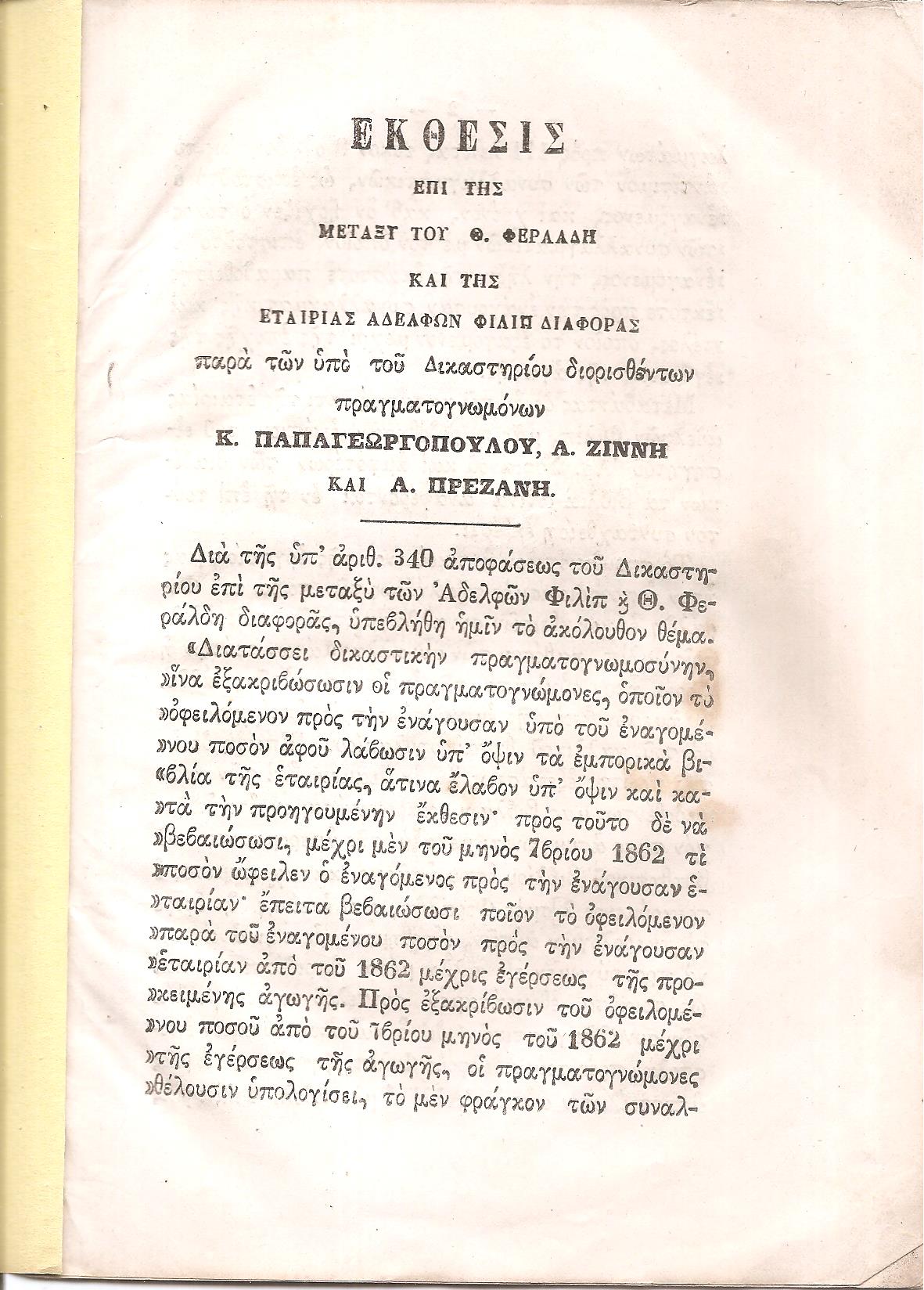ΕΚΘΕΣΙΣ Α. Ζίννη Λογιστού της Εθνικής Τραπέζης Κ. Παπαγεωργοπούλου Λογιστού της Γεν. Πιστωτικής Τραπέζης και Α. Πρεζάνη Ταμίου της Βιομηχανικής Τραπέζης διορισθέντων πραγματογνωμόνων δυνάμει αποφάσεως των εν Αθήναις Εμποροδικών εις την μεταξύ της εταιρίας των αδελφών Φιλίπ και Θ. Φεράλδη διαφοράν. Εν Αθήναις, ΤΥΠΟΙΣ «ΑΛΗΘΕΙΑΣ», 1877, 8ο, σελ. 16 (στην αρχή του κειμένου ο τίτλος: ΄Εκθεσις επί της μεταξύ του Θ. Φεράλδη και της Εταιρίας Αδελφών Φιλίπ διαφοράς…, ΗΛΙΟΥ-ΠΟΛΕΜΗ αρ. 1877.147, σπάνιο)