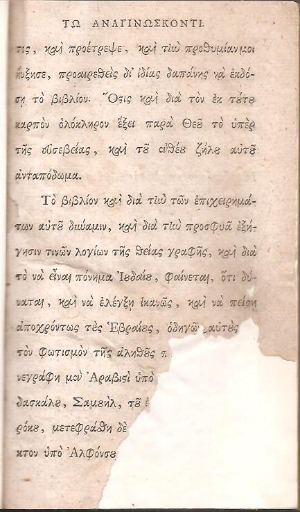 Πόνημα χρυσούν Σαμουήλ Ραββί του Ιουδαίου εξελέγχον την των Ιουδαίων πλάνην. Πρώτον μεν, εκ της αραβικής εις την λατινίδα μεταφρασθέν. Νυν δε εκ της λατινίδος εις την κοινήν των Ελλήνων διάλεκτον. Εν Λειψία 1769 ΤΥΠΟΓΡΑΦΙΑ ΤΟΥ ΒΡΕΪΤΚΟΠΦ, 8ο, σελ. 8χ.α+163+5χ.α. (Λείπει η σελίδα τίτλου και οι πρώτες 4 σελίδες, λείπουν κομμάτια και είναι συντηρημένες 20 σελίδες επηρεάζοντας το κείμενο, βιβλιοδεσία εποχής, μεταφραστής Νικηφόρος Θεοτόκης, ΠΑΠΑΔΟΠΟΥΛΟΣ Α, αρ.5200.00)