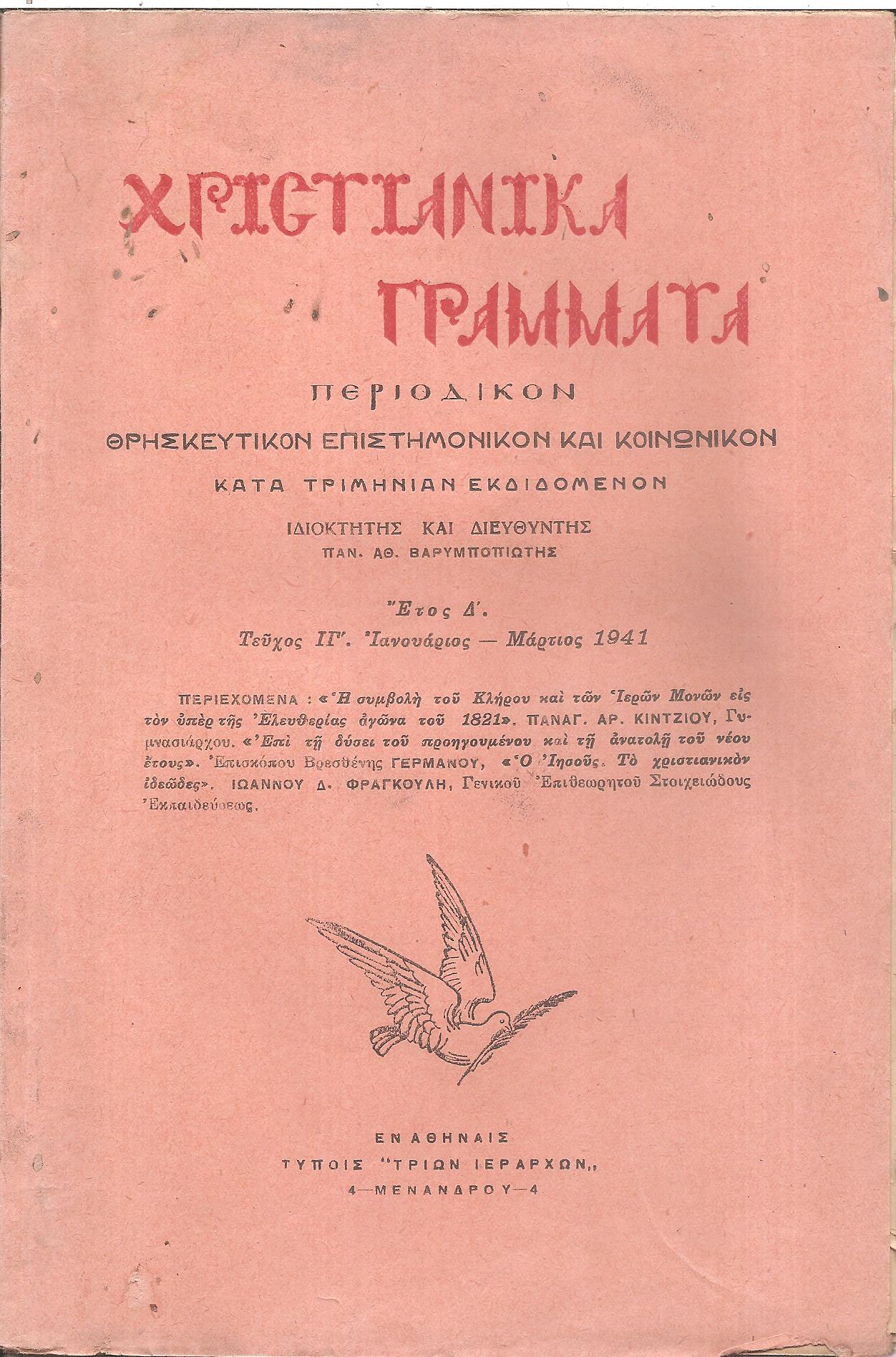 ΧΡΙΣΤΙΑΝΙΚΑ ΓΡΑΜΜΑΤΑ 1938-1941, έτη Α΄-Δ΄, Περιοδικόν θρησκευτικόν, επιστημονικόν και κοινωνικόν κατά τριμηνίαν εκδιδόμενον