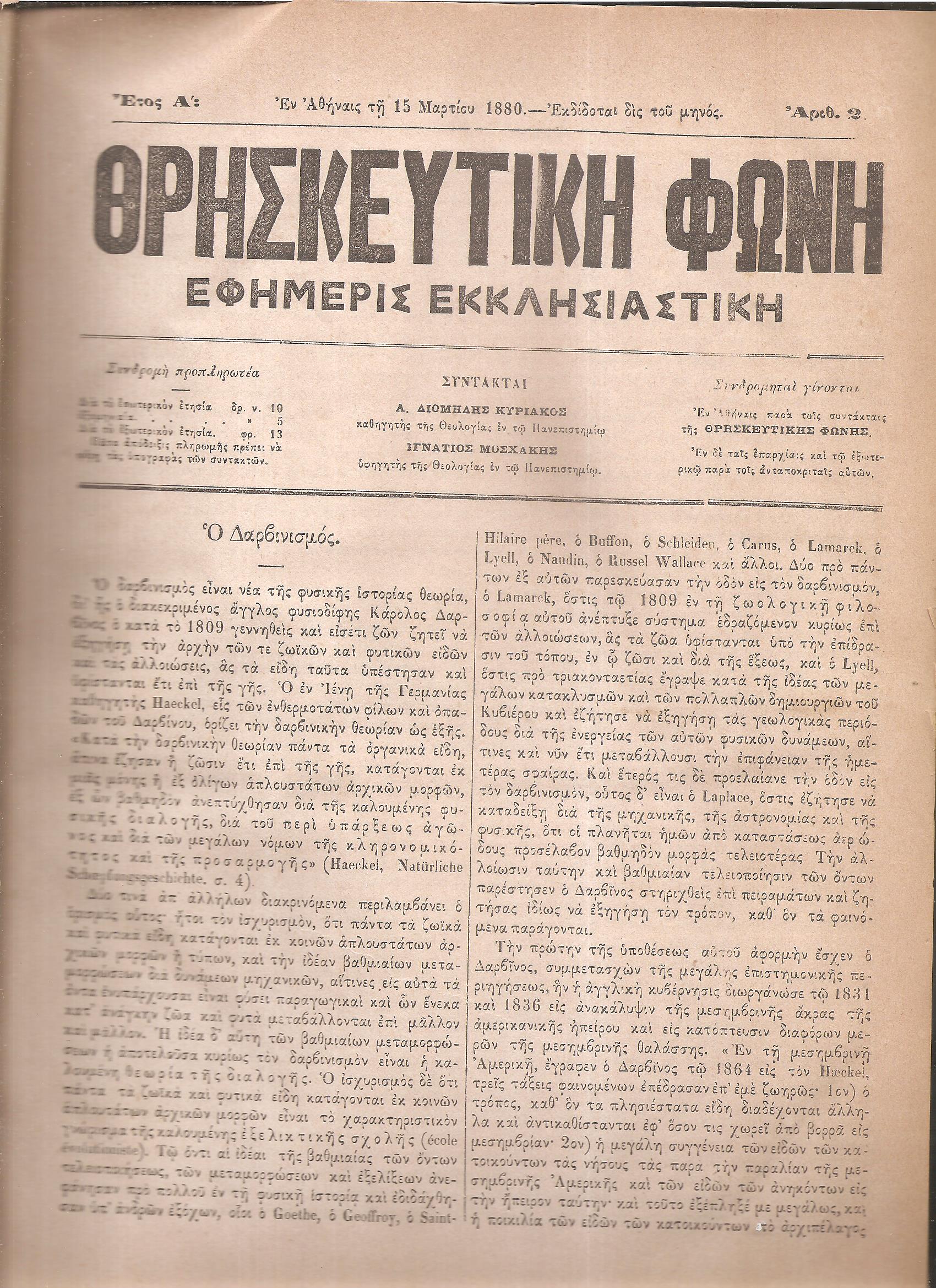 ΘΡΗΣΚΕΥΤΙΚΗ ΦΩΝΗ 1880-1883, Εφημερίς Εκκλησιαστική εκδιδομένη δις του μηνός. Συντάκται : Α. ΔΙΟΜΗΔΗΣ ΚΥΡΙΑΚΟΣ-ΙΓΝΑΤΙΟΣ ΜΟΣΧΑΚΗΣ. Εν Αθήναις 1880-1883, 4ο [22Χ31,3] (έτος Α΄, τεύχη αρ. 1[1 Μαρτίου 1880]-αρ. 24[15 Φεβρουαρίου 1881], σελ. 288, έτος Β΄, τεύχη αρ 25[1 Μαρτίου 1881]-αρ. 48[15 Φεβρουαρίου 1882], σελ. 288, έτος Γ΄, τεύχη αρ. 49[1 Μαρτίου 1882]-αρ. 60[15 Αυγούστου 1882], σελ. 144[Α΄ εξάμηνο του Γ΄ έτους]). Τα τρία έτη δεμένα σε ένα τόμο. Αντίτυπο σε καλή κατάσταση με εξαίρεση τη βιβλιοδεσία εποχής που είναι ταλαιπωρημένη, χωρίς ράχη και το μπροστινό καπάκι αποκολλημένο από το σώμα. Λάθη τυπογραφικά στη σελιδαρίθμηση: στο Α΄ έτος το 9ο τεύχος τελειώνει σ. 108 & το 10ο τεύχος αρχίζει σ. 105, το 11ο τεύχος τελειώνει σ. 128 & το 12ο τεύχος αρχίζει σ.133 και στο 25ο τεύχος του έτους Β΄ λάθος θέση από τον βιβλιοδέτη οι σελίδες 9-10.