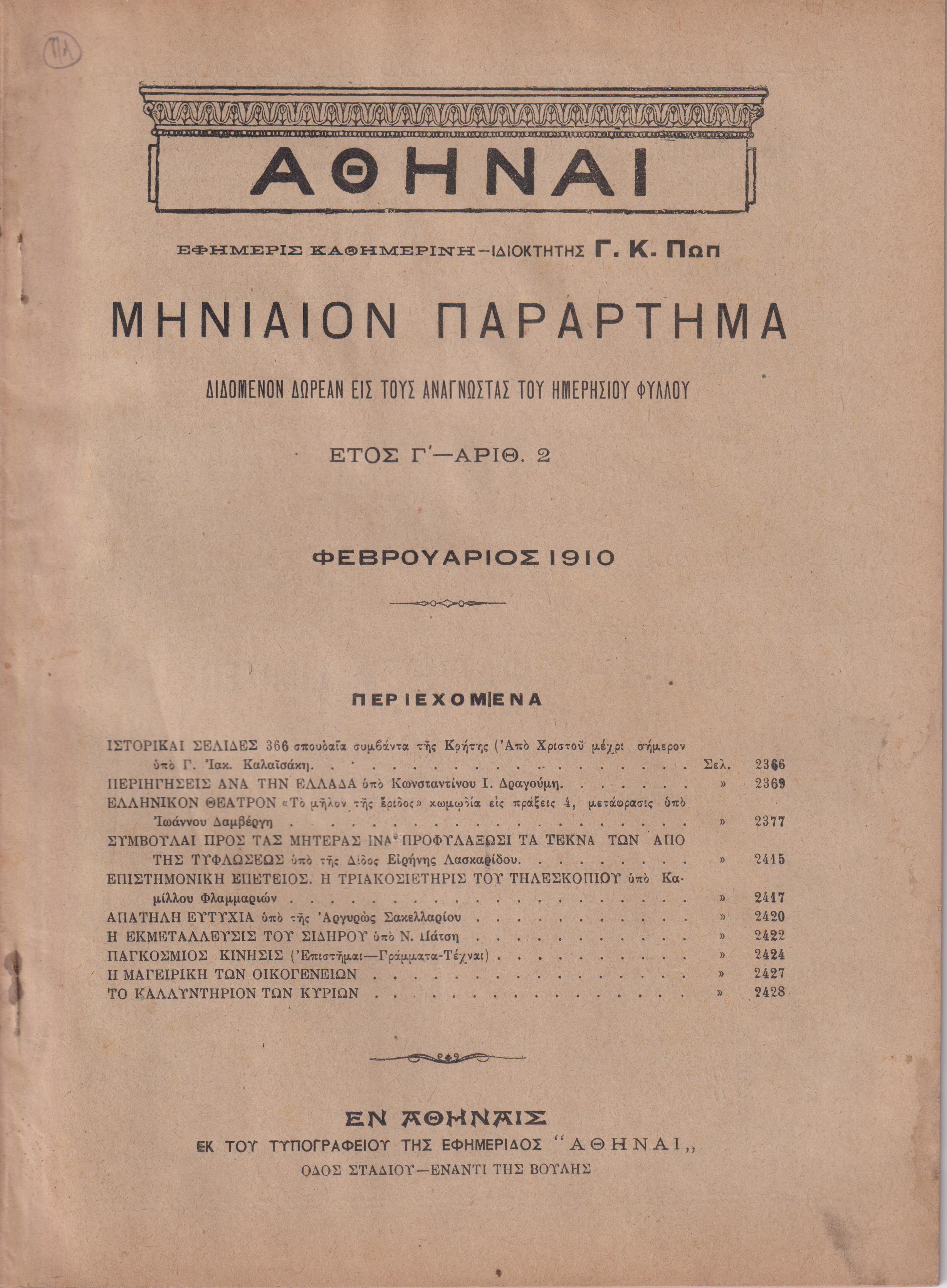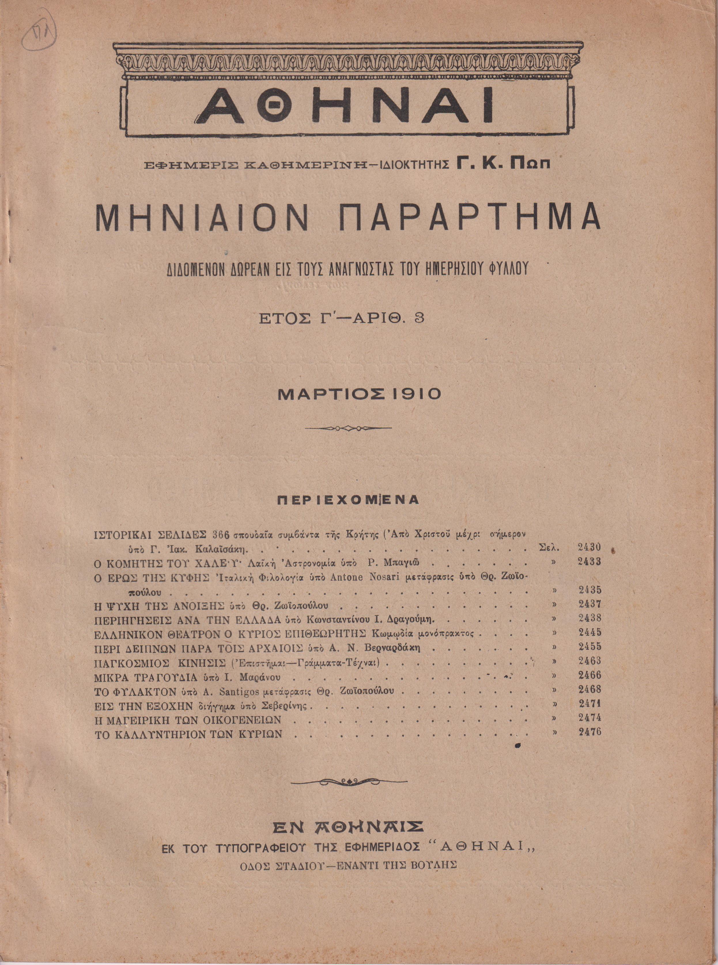 ΑΘΗΝΑΙ-Μηνιαίον παράρτημα έτος Γ΄,τεύχη αρ. 1-12[Ιανουάριος-Δεκέμβριος 1910]