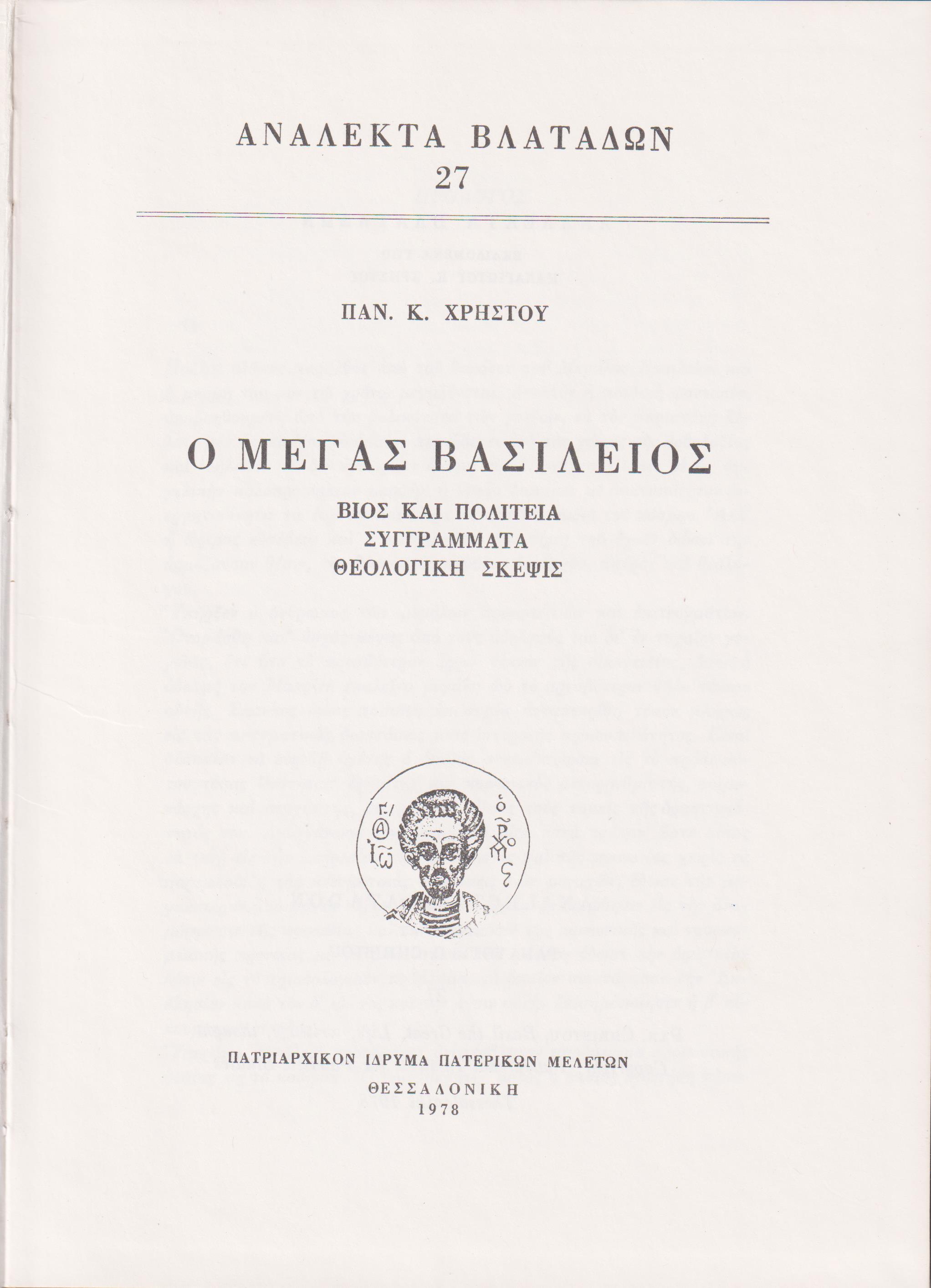 ΧΡΗΣΤΟΥ ΠΑΝ. Κ., Ο Μέγας Βασίλειος-Βίος και πολιτεία,συγγράμματα, θεολογική σκέψις. Θεσσαλονίκη 1978, 8ο, σελ. 355+1λ+4χ.α. (βιομηχ. βιβλιοδεσία, έκδοση ΠΑΤΡΙΑΡΧΙΚΟΝ ΙΔΡΥΜΑ ΠΑΤΕΡΙΚΩΝ ΜΕΛΕΤΩΝ )