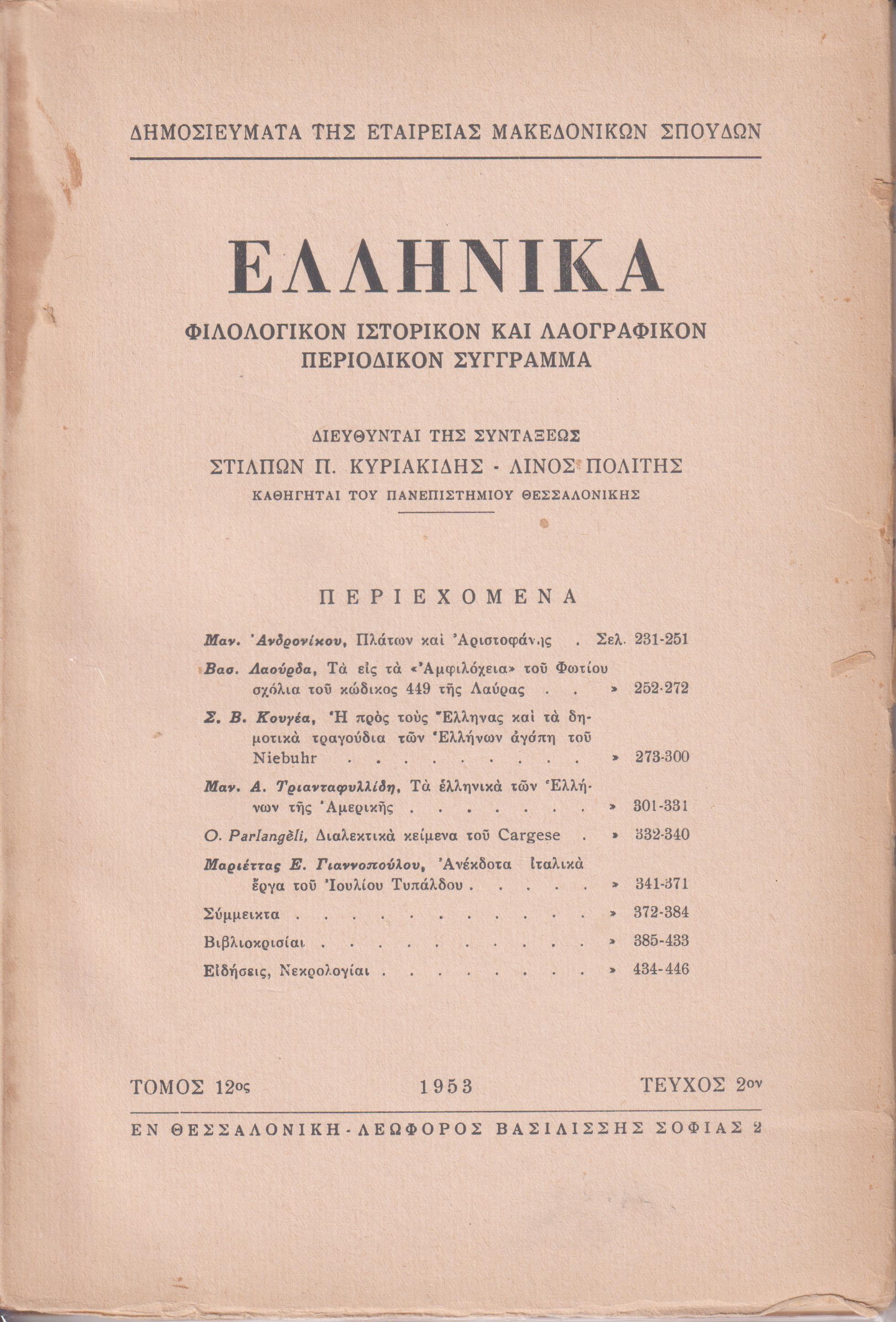 ΕΛΛΗΝΙΚΑ τόμος Ι2ος 1952-1953, τεύχη 1-2, Φιλολογικόν, ιστορικόν & λαογραφικον περιοδικόν σύγγραμμα. Διευθυνταί της συντάξεως : ΣΤΙΛΠΩΝ Π. ΚΥΡΙΑΚΙΔΗΣ-ΛΙΝΟΣ ΠΟΛΙΤΗΣ. Εν Θεσσαλονίκη 1952, 8ο, σελ. φ.2+229+1λ+[231]-450 (τα δύο τεύχη με τα εξώφυλλά τους). ΠΛΗΡΗΣ ΤΟΜΟΣ