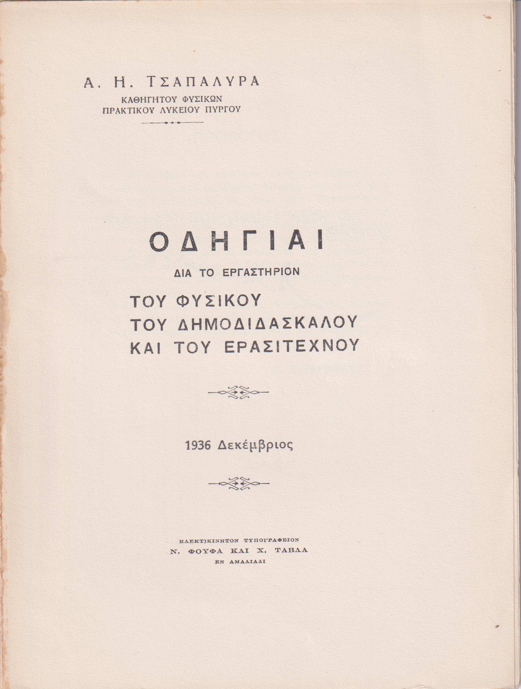 ΤΣΑΠΑΛΥΡΑΣ Α.Η. , Οδηγίαι διά το εργαστήριον του Φυσικού, του Δημοδιδασκάλου και του Ερασιτέχνου . Εν Αμαλιάδι 1937, 8ο, σελ.  70  (ΤΣΑΠΑΛΥΡΑΣ Α.Η. : Καθηγητής Φυσικών Πρακτικού Λυκείου Πύργου)