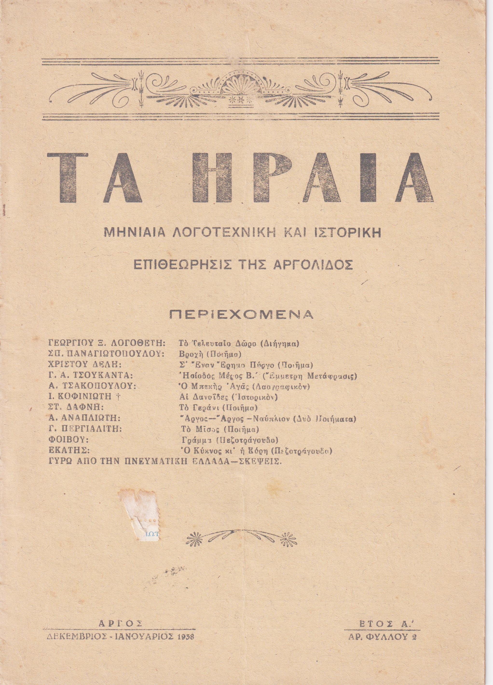 ΗΡΑΙΑ [ΤΑ] 1937-1940, Μηνιαία Λογοτεχνική και Ιστορική Επιθεώρησις της Αργολίδος. Ιδρυταί: Γ. Λογοθέτης- Γ. Τσουκαντάς. ΄Αργος 1937-1940, 8ο, σελ. 16[έκαστο τεύχος], (Διαθέτουμε τα τεύχη: ΄Ετος Α΄, αρ. 1[Νοέμβριος 1937] έως ΄Ετος Γ΄, αρ. 32-33[Οκτώβριος-Νοέμβριος 1940]. Λείπει το 16ο τεύχος [Απρίλιος 1939]. Δημοσιεύματα των : ΓΕΩΡΓΙΟΥ Ξ. ΛΟΓΟΘΕΤΗ, Γ. ΤΣΟΥΚΑΝΤΑ, ΓΙΑΝΝΗ ΠΕΡΓΙΑΛΙΤΗ, ΦΟΙΒΟΥ, ΣΤΕΦ. ΔΑΦΝΗ, Γ. ΝΕΖΟΥ, Σ. ΔΗΜΟΠΟΥΛΟΥ, Α. ΑΝΑΠΛΙΩΤΗ, ΕΚΑΤΗΣ, ΧΡΙΣΤΟΥ ΔΕΛΗ, Α. ΤΣΑΚΟΠΟΥΛΟΥ, Κ. Ν. ΟΛΥΜΠΙΟΥ, Ε. ΜΠΟΜΠΟΥ, ΜΕΜΑΣ ΠΡΙΦΤΗΣ, ΤΩΝΗ ΑΡΓΕΙΤΗ, Γ. Θ. ΜΑΛΤΕΖΟΥ, ΤΑΚΗ ΔΟΞΑ, Γ. ΦΙΛΙΠΠΟΠΟΥΛΟΥ, ΑΛΕΚΟΥ ΜΟΥΤΖΟΥΡΙΔΗ, ΑΙΜΙΛΙΑΣ ΣΤΕΦ. ΔΑΦΝΗ, ΥΠΑΤΙΑΣ ΔΕΛΗ, ΓΙΑΝΝΗΣ ΒΟΥΛΓΑΡΙΔΗΣ, ΤΑΚΗΣ ΤΑΧΤΙΚΟΣ, Ι. Κ. ΚΟΦΙΝΙΩΤΗ, ΓΙΑΝΝΗ ΦΛΙΑΣΙΟΥ, ΕΡΑΣΜΟΥ, ΝΙΚ. Σ. ΓΚΙΝΟΠΟΥΛΟΥ, ΠΑΝ. ΔΗΜ. ΣΕΦΕΡΛΗ, Δ. ΔΑΝΟΠΟΥΛΟΥ, ΠΑΥΛΟΥ ΡΟΥΜΠΕΚΑ, ΝΙΚΟΥ ΤΡΙΒΙΖΑ, ΒΑΣ. Κ. ΛΟΝΤΟΥ, ΔΗΜ. ΒΑΡΔΟΥΝΙΩΤΗ, ΠΑΝΟΥ Ν. ΚΑΡΑΒΙΑ, ΓΙΑΝΝΗ ΦΩΤΑΚΗ, ΑΓ. ΤΣΕΛΑΛΗ, ΑΓΓΕΛΟΥ ΧΑΔΙΑΡΑΚΟΥ κ.α. Σύνολον 21 τεύχη μονά ή διπλά.