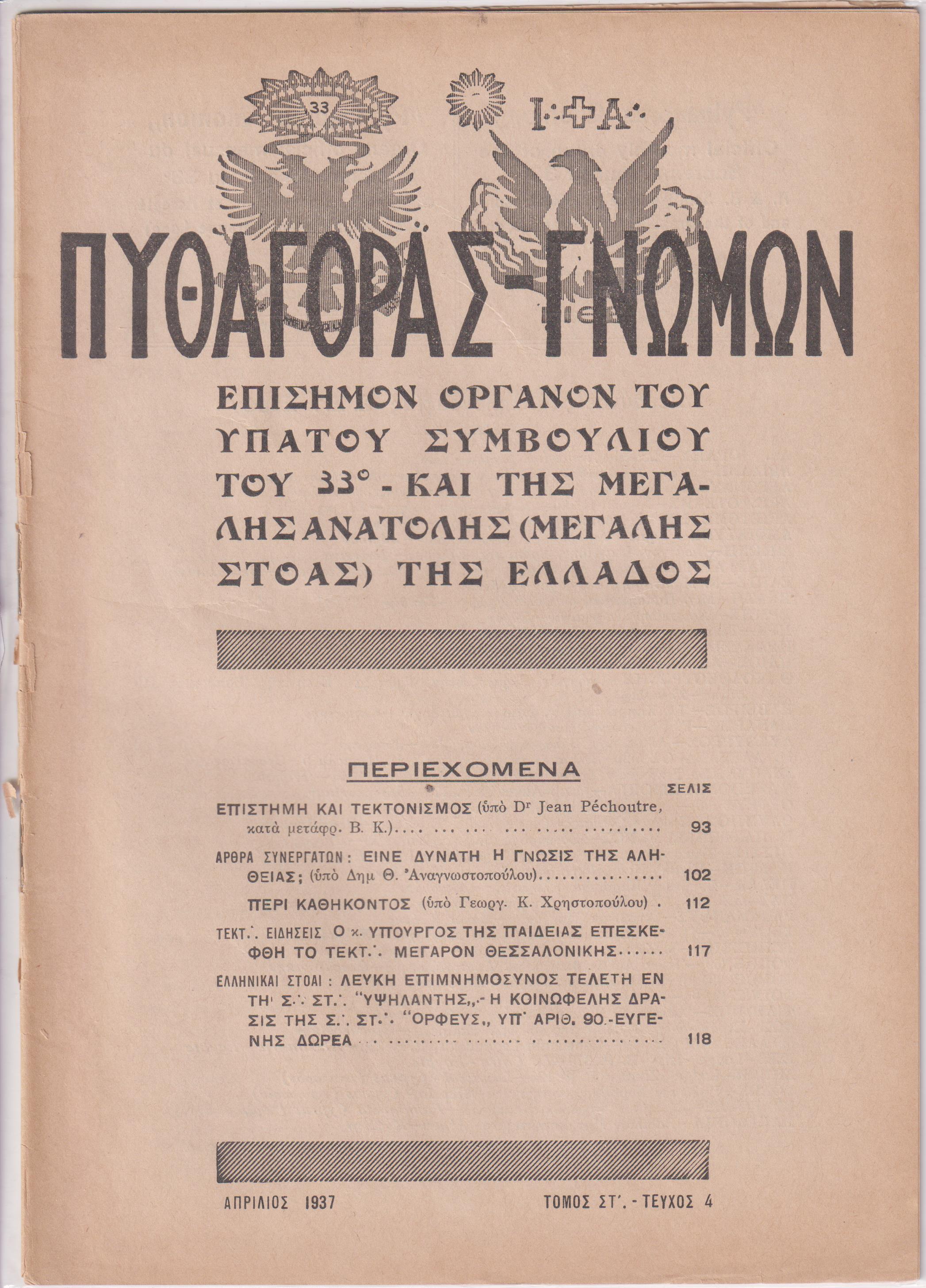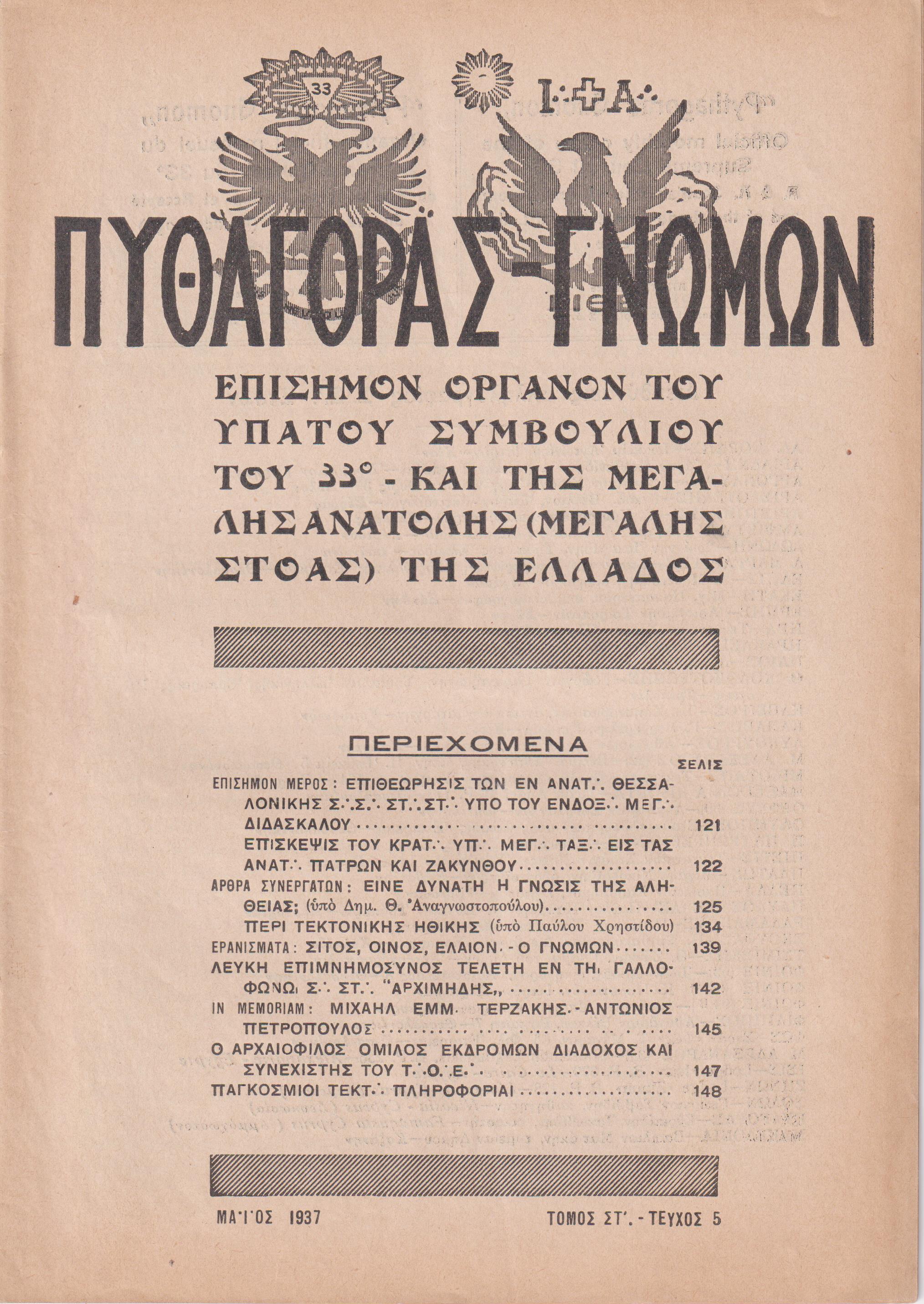 ΠΥΘΑΓΟΡΑΣ-ΓΝΩΜΩΝ 1937, Τόμος ΣΤ΄, Επίσημον ΄Οργανον του Υπάτου Συμβουλίου του 33ο και της Μεγάλης Ανατολής της Ελλάδος. Γραμματεύς της Συντάξεως ΣΤΑΜΟΣ ΜΠΡΑΝΙΑΣ . Αθήναι 1937, 8ο, σελ. 286+2λ (ήτοι τα τεύχη: αρ. 1[Ιανουάριος 1937, σελ. 28], τεύχος αρ. 2[Φεβρουάριος 1937, σελ. 29-60], τεύχος αρ. 3[Μάρτιος 1937, σελ. 61-92], τεύχος αρ. 4[Απρίλιος 1937, σελ. 93-120], τεύχος αρ. 5[Μάϊος 1937, σελ. 121-148], τεύχος αρ. 6[Ιούνιος 1937, σελ.149-176], αρ. 7-8[Ιούλιος-Αύγουστος 1937, σελ. 177- 204, χωρίς εξώφυλλο], αρ. 9-10[Σεπτέμβριος-Οκτώβριος 1937, σελ. 205-232, χωρίς εξώφυλλο], τεύχος αρ. 11 [Νοέμβριος 1937, σελ. 233-260], τεύχος αρ. 12 [Δεκέμβριος 1937, σελ. 261-286+2λ]. ΠΛΗΡΗΣ ΤΟΜΟΣ