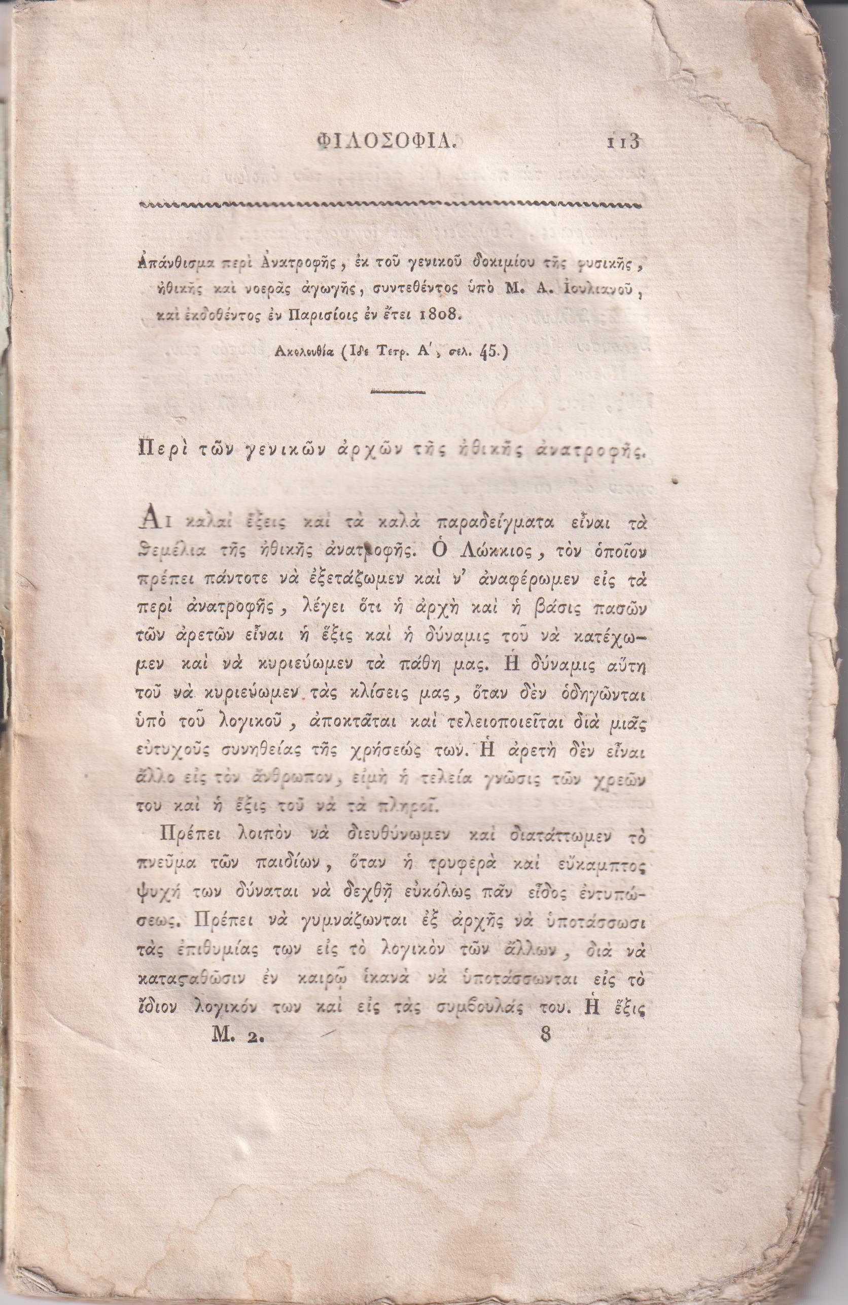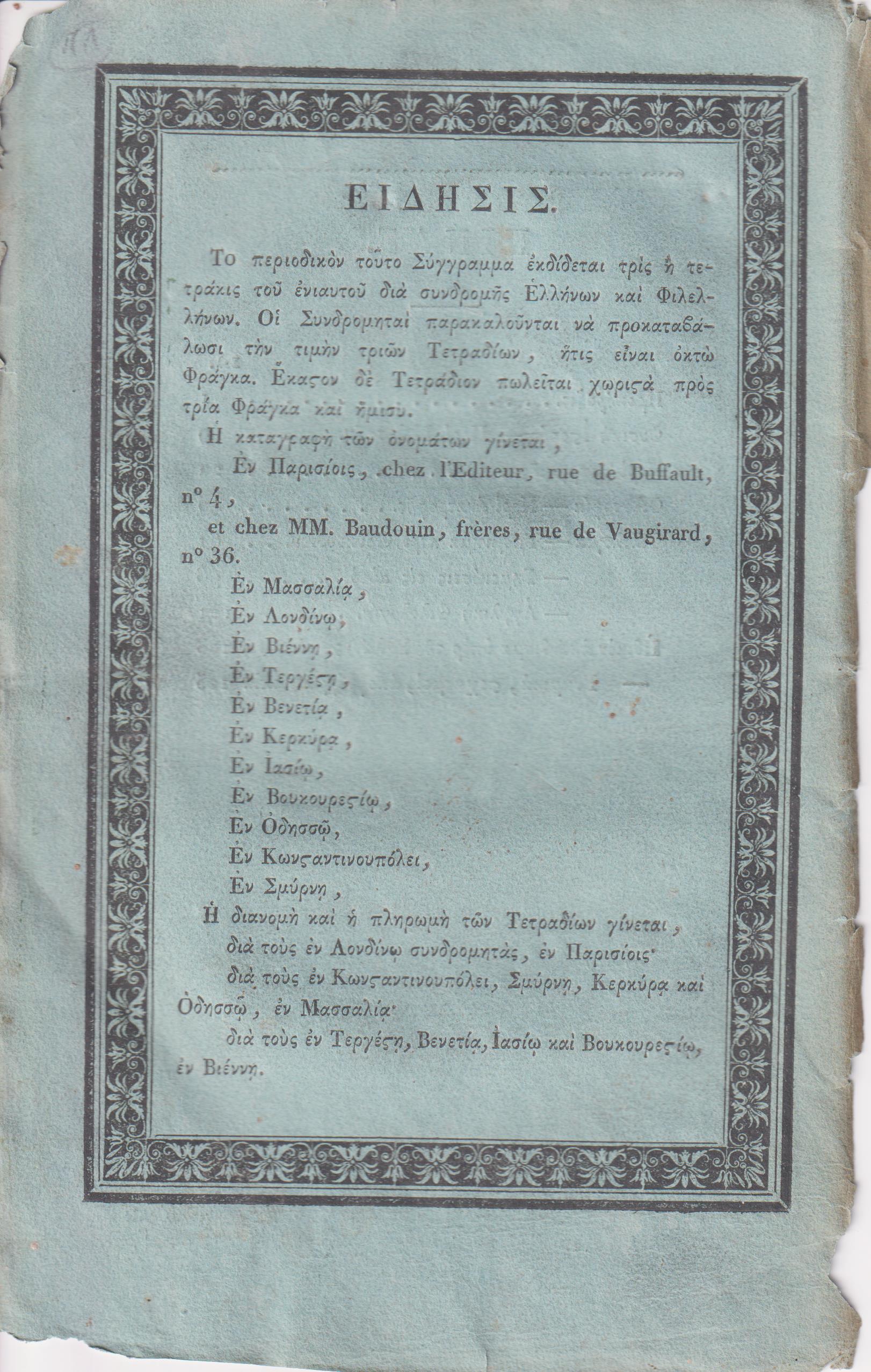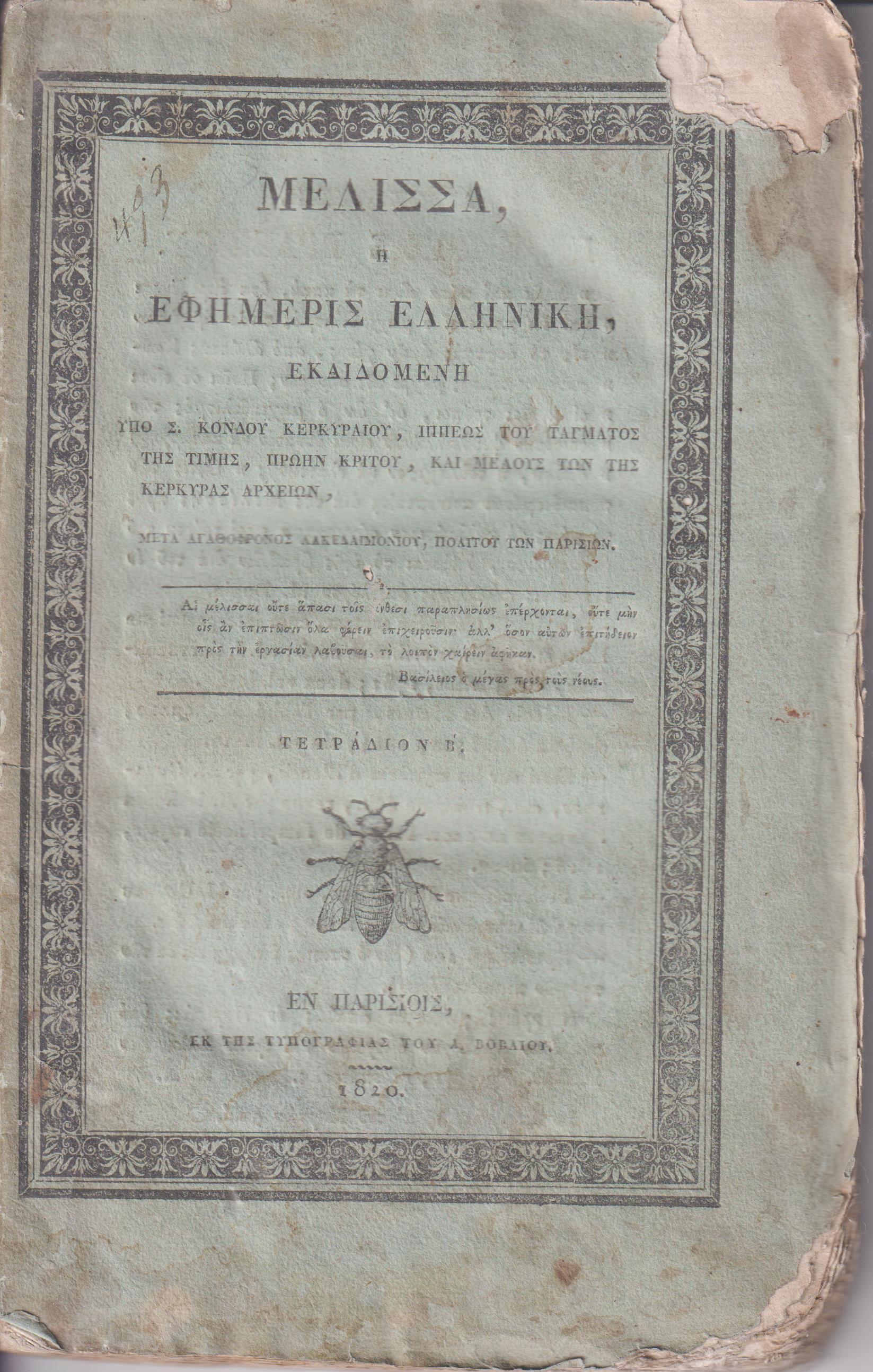 ΜΕΛΙΣΣΑ ή ΕΦΗΜΕΡΙΣ ΕΛΛΗΝΙΚΗ, Τετράδια Α΄& Β΄(μόνο), Εκδιδομένη υπό Σ. Κονδού Κερκυραίου… Εν Παρισίοις 1819-1820, ΕΚ ΤΗΣ ΤΥΠΟΓΡΑΦΙΑΣ ΤΟΥ Α. ΒΟΒΑΙΟΥ,8ο. Τετράδιον Α΄, σελ. φ. 2+η΄+[13]-112 (λείπει το εμπροσθόφυλλο, άκοπα φύλλα από σελ. 25-96). Τετράδιον Β΄, σελ. 113-242 +2χ.α. (η σελίδα τίτλου λείπει; αντίτυπο ταλαιπωρημένο, ίχνη υγρασίας σε όλες τις σελίδες[μονές-ζυγές στο κάτω μέρος)