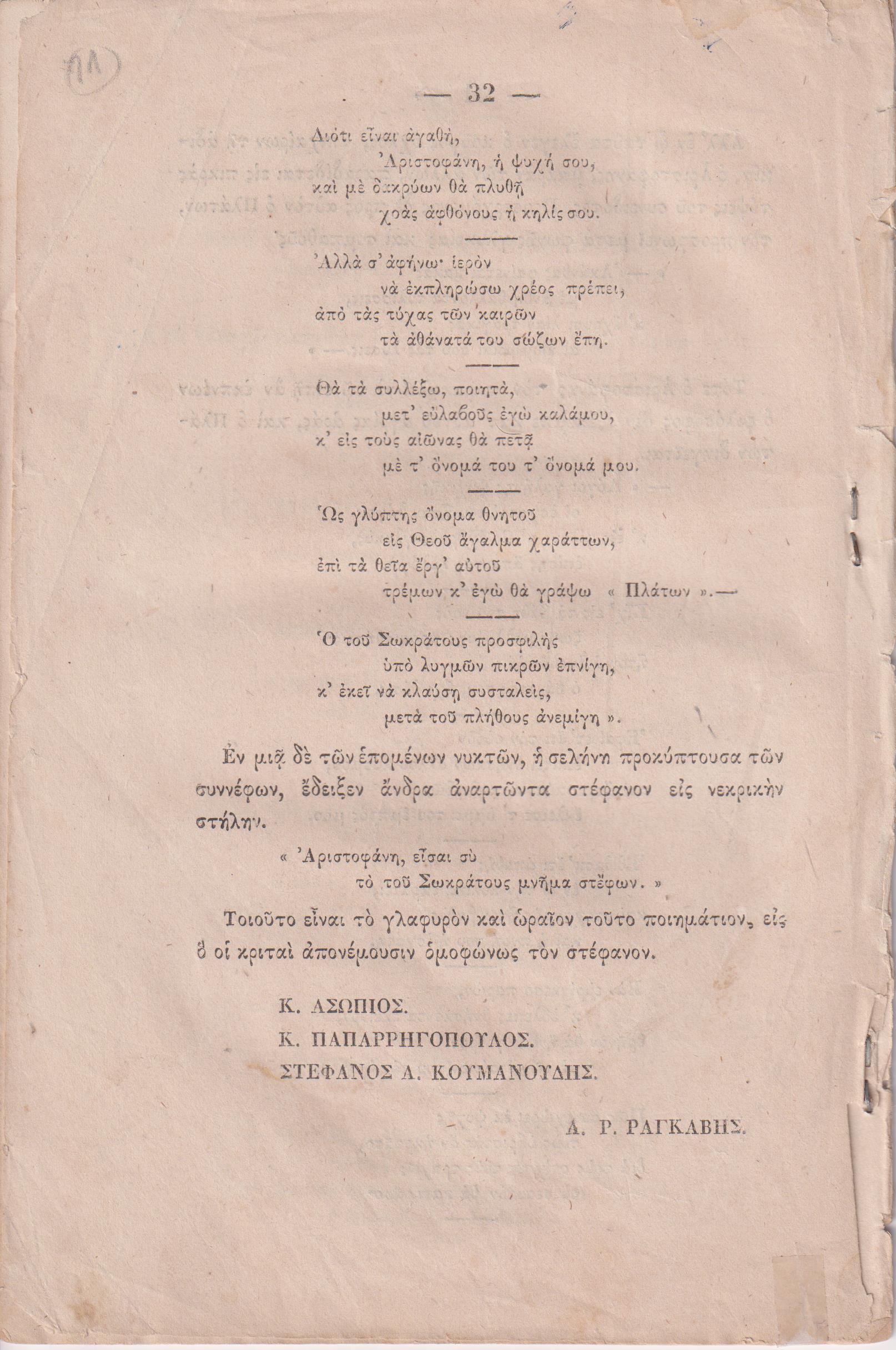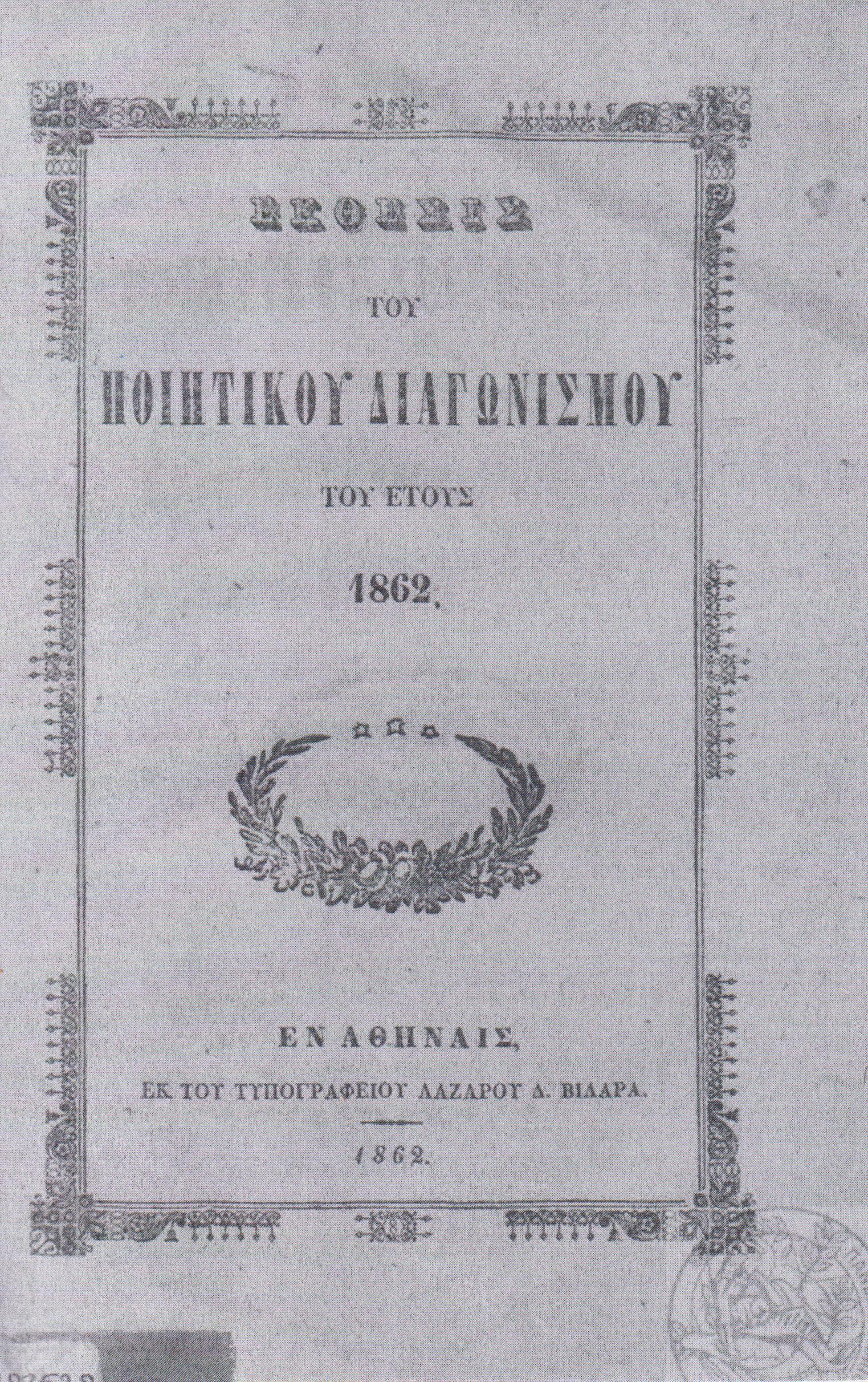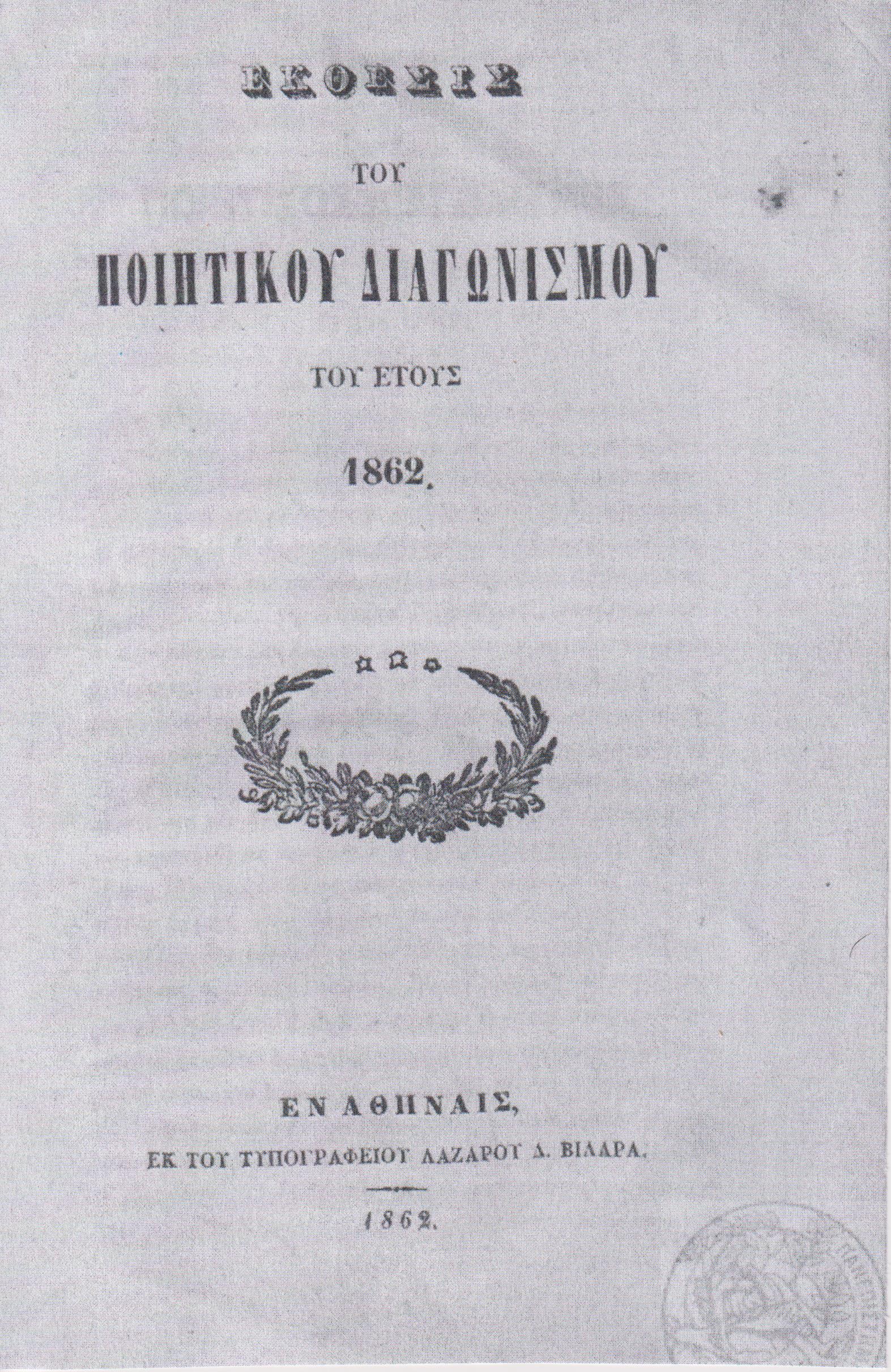 ΕΚΘΕΣΙΣ του Ποιητικού Διαγωνισμού του έτους 1862. Εν Αθήναις, ΕΚ ΤΟΥ ΤΥΠΟΓΡΑΦΕΙΟΥ ΛΑΖΑΡΟΥ Δ. ΒΙΛΑΡΑ, 1862, 8ο, σελ. 32 (αντίτυπο ταλαιπωρημένο, λυτό, λείπουν: εξώφυλλο και σελίδα τίτλου, σε αντίγραφα,   ΓΚΙΝΗΣ-ΜΕΞΑΣ αρ. 1862.152 & ΓΚΙΝΗΣ-ΜΕΞΑΣ αρ. 9063)