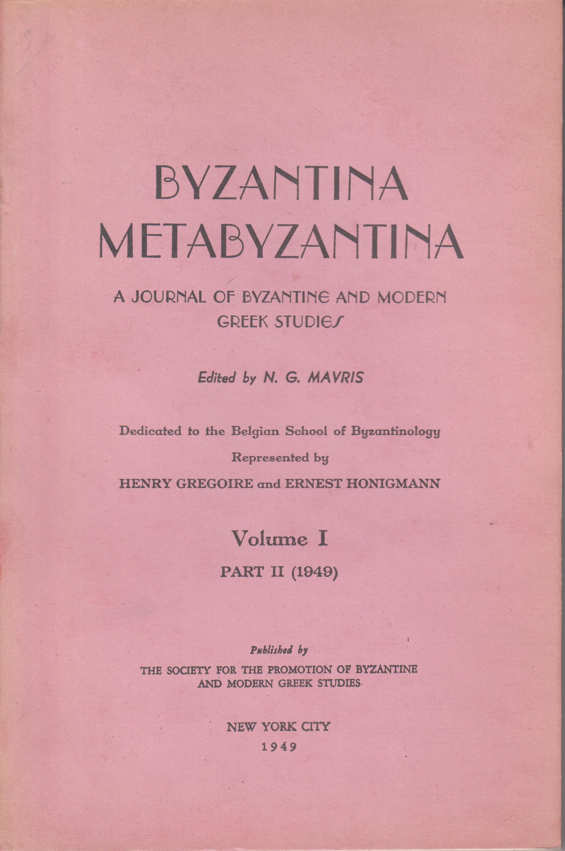 ΒΥΖΑΝΤΙΝΑ-ΜΕΤΑΒΥΖΑΝΤΙΝΑ, A Journal of Byzantine and Modern Greek Studies. Edited by N. G. Mavris. Dedicated to the