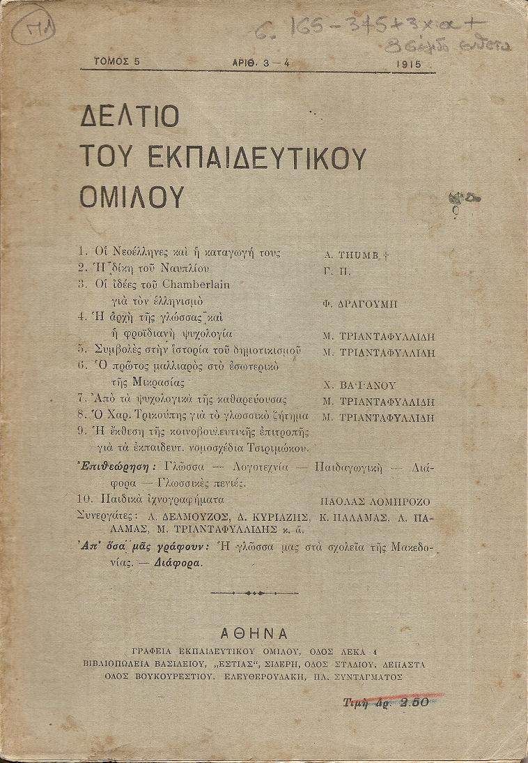 ΔΕΛΤΙΟ ΤΟΥ ΕΚΠΑΙΔΕΥΤΙΚΟΥ ΟΜΙΛΟΥ , τόμος 5ος,1915, τεύχη αρ. 1-2 & 3-4 , 1915, Αθήνα 1915, 8ο, σελ. 2φ+164+4χ.α.+165-345+3χ.α.+8σέλιδο ένθετο ( Περιεχόμενα τεύχους με αρ. 1-2 : ΤΡΙΑΝΤΑΦΥΛΛΙΔΗ Μ., Το έργο του Ομίλου.- 1. ΤΡΙΑΝΤΑΦΥΛΛΙΔΗ Μ., Η γλώσσα μας στα σχολεία της Μακεδονίας.- 2. ΦΩΤΕΙΝΟΥ Δ., ΄Εθνος και γλώσσα.- 3. ΓΡΗΓΟΡΙΟΥ ΕΥ., Η προτιμότερη γλώσσα γιά το δημοτικό σχολείο.- 4. ΘΕΟΔΩΡΟΠΟΥΛΟΥ ΑΥ.(Κας), Το «Κυριακό σχολείο εργατριών».- Μεταφράσεις : 5. ΛΟΜΠΡΟΖΟ ΠΑΟΛΑΣ, Παιδικά ιχνογραφήματα.- 6. SEVRETTE G., Η τέχνη στο αγγλικό σχολείο.- Νεκρολογία : ΤΣΙΡΙΜΩΚΟΥ Μ., Κωστής Τοπάλης.- Επιθεώρηση : Γλώσσα-Λογοτεχνία-Διάφορα-Μουσική-Η γλώσσα μας στην κοινωνική ζωή-Γλωσσικές πενιές.- Απ’όσα μας γράφουν-Διάφορα. Περιεχόμενα τεύχους με αρ. 3-4 : 1. THUMB A., Οι Νεοέλληνες και η καταγωγή τους.- 2. Γ.Π., Η δίκη του Ναυπλίου.- 3. ΔΡΑΓΟΥΜΗ Φ., Οι ιδέες του Chamberlain γιά τον ελληνισμό.- 4. ΤΡΙΑΝΤΑΦΥΛΛΙΔΗ Μ., Η αρχή της γλώσσας και φροϊδιανή ψυχολογία.- 5. ΤΡΙΑΝΤΑΦΥΛΛΙΔΗ Μ., Συμβολές στην ιστορία του δημοτικισμού.- 6. ΒΑΪΑΝΟΥ Ν., Ο πρώτος μαλλιαρός στο εσωτερικό της Μικρασίας.- 7. ΤΡΙΑΝΤΑΦΥΛΛΙΔΗ Μ., Από τα ψυχολογικά της καθαρεύουσας.- 8. ΤΡΙΑΝΤΑΦΥΛΛΙΔΗ Μ., Ο Χαρ. Τρικούπης γιά το γλωσσικό ζήτημα.- 9. Η έκθεση της κοινοβουλευτικής επιτροπής γιά τα εκπαιδευτ. νομοσχέδια Τσιριμώκου.- Επιθεώρηση : Γλώσσα-Λογοτεχνία-Παιδαγωγική-Διάφορα-Γλωσσικές πενιές.-10 ΛΟΜΠΡΟΖΟ ΠΑΟΛΑΣ, Παιδικά ιχνογραφήματα .- Συνεργάτες : Α. ΔΕΛΜΟΥΖΟΣ, Δ. ΚΥΡΙΑΖΗΣ, Κ. ΠΑΛΑΜΑΣ, Λ. ΠΑΛΑΜΑΣ, Μ. ΤΡΙΑΝΤΑΦΥΛΛΙΔΗΣ κ.α.- Απ’όσα μας γράφουν : Η γλώσσα μας στα σχολεία της Μακεδονίας.- Διάφορα ). Τα τεύχη 1-2 & 3-4 με τα εξώφυλλά τους, άκοπα φύλλα, ΠΛΗΡΗΣ ΤΟΜΟΣ