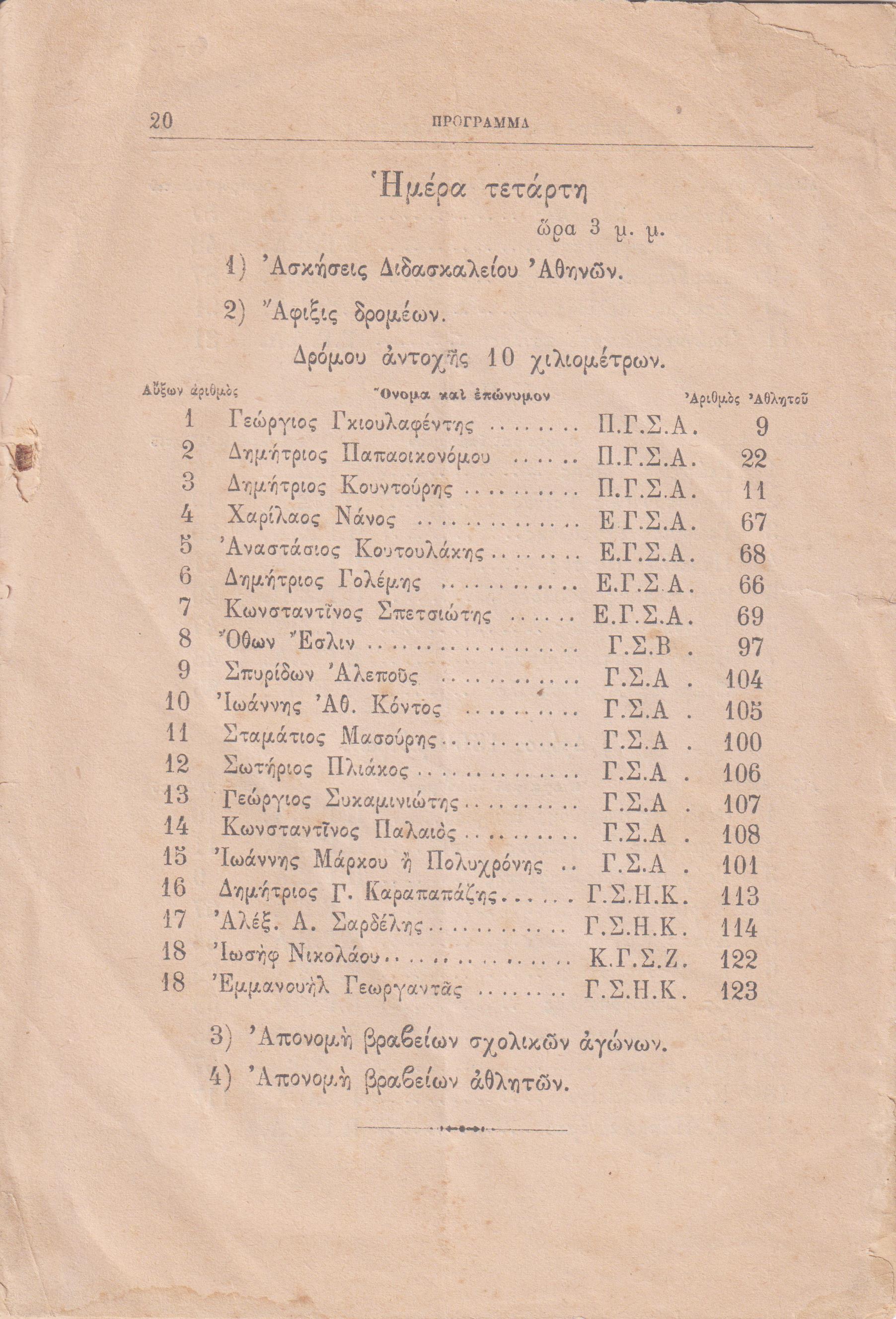 ΠΡΟΓΡΑΜΜΑ Πρώτων αγώνων του Συνδέσμου των Ελληνικών Αθλητικών καί Γυμναστικών Σωματείων τελεσθησομένων εν τω Παναθηναϊκώ Σταδίω την 5,6,7 καί 8 Απριλίου 1901. Εν Αθήναις 1901,8ο,σελ.20 (λίγο ταλαιπωρημένο)