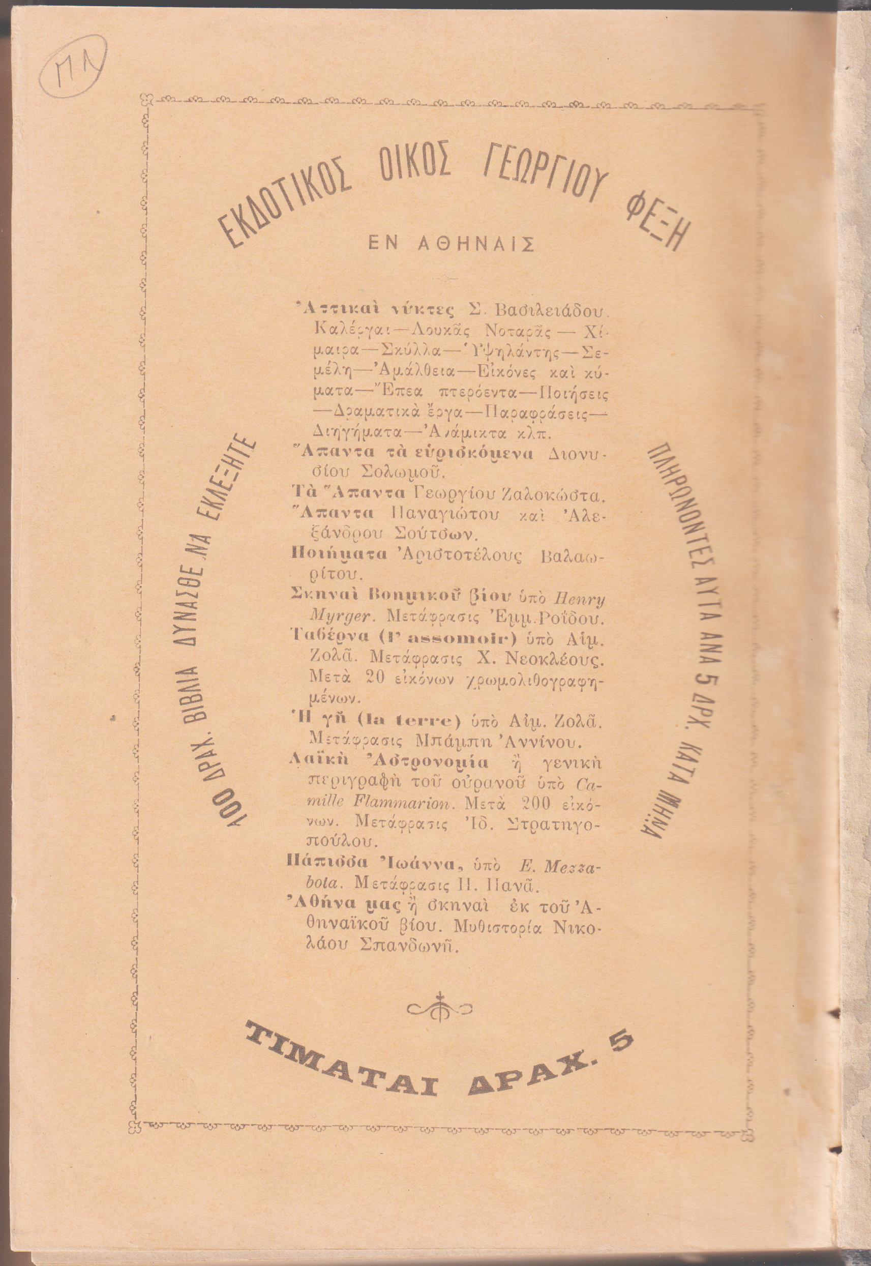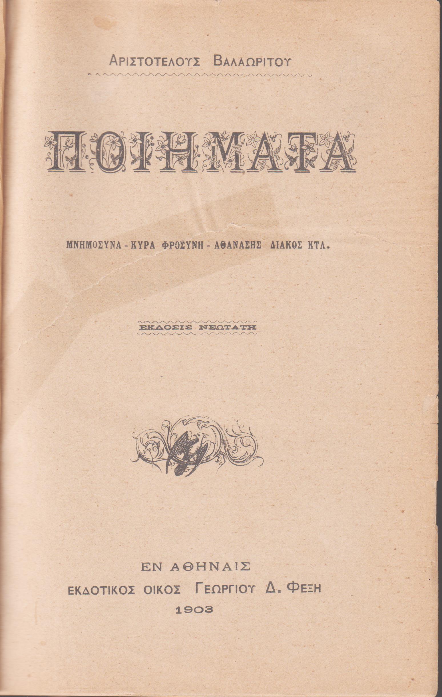 ΒΑΛΑΩΡΙΤΗΣ ΑΡΙΣΤ., Ποιήματα. (μνημόσυνα-κυρά Φροσύνη- Αθανάσης Διάκος).΄Εκδοσις νεωτάτη. Εν Αθήναις 1903, 8ο, σελ.720 (έκδ.ΦΕΞΗ)(βιβλιοδ.)