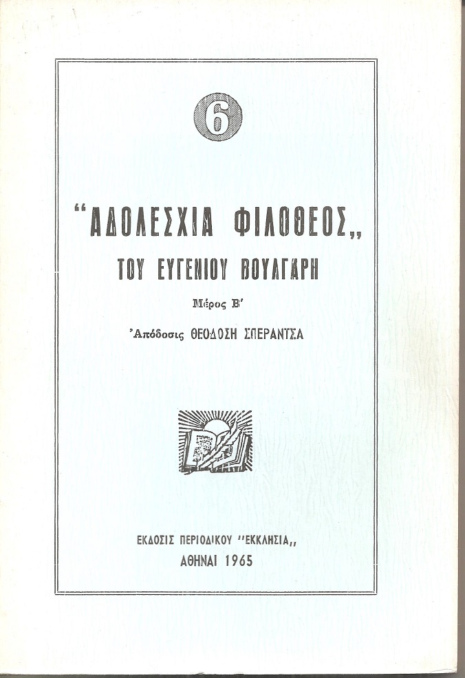 ΒΟΥΛΓΑΡΗΣ ΕΥΓΕΝΙΟΣ, Αδολεσχία Φιλόθεος του Ευγένιου Βούλγαρη, τόμοι Α΄-Γ΄ .Απόδοσις Θεοδόση Σπεράντζα. Αθήναι 1962-67, 8ο, σελ. 368+239+221