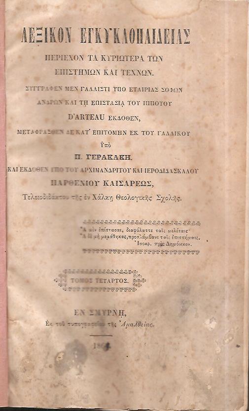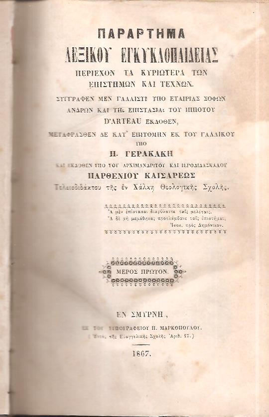 ΣΥΛΛΟΓΙΚΟ, Λεξικόν Εγκυκλοπαιδείας περιέχον τα κυριώτερα των επιστημών και τεχνών. Τόμοι: 1ος, 4ος,+Παράτημα μέρος 1ον . Συγγραφέν μεν γαλλιστί υπό Εταιρίας σοφών ανδρών και τη επιστασία του Ιππότου D’Arteau εκδοθέν. Μεταφρασθέν δε κατ’επιτομήν εκ του Γαλλικού υπό Π. ΓΕΡΑΚΑΚΗ και εκδοθέν υπό του Αρχιμανδρίτου και ιεροδιδασκάλου ΠΑΡΘΕΝΙΟΥ ΚΑΙΣΑΡΕΩΣ. Εν Σμύρνη, ΕΚ ΤΟΥ ΤΥΠΟΓΡΑΦΕΙΟΥ Π. ΜΑΡΚΟΠΟΥΛΟΥ, 1861,1864,1867, 8ο, σελ. 2.684 (τόμος 1ος : Εν Σμύρνη 1861, σελ. η΄+[9]-892, τόμος 4ος : Εν Σμύρνη 1864, σελ. 898, Παράρτημα, μέρος πρώτον : Εν Σμύρνη 1867, σελ. 894+2λ (τρείς[3] τόμοι δερματόδετοι εποχής)