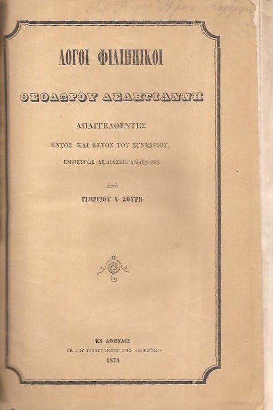 ΣΟΥΡΗΣ Γ. Χ., Από γαμβρός παράνυμφος Κωμωδία μονόπρακτος. Αθήνησι, ΕΚ ΤΟΥ Τ[Ο]ΠΟΓΡΑΦΕΙΟΥ ΤΗΣ ΕΦΗΜΕΡΙΔΟΣ ΤΩΝ ΣΥΖΗΤΗΣΕΩΝ, 1873, 8ο , σ. 47+1λ (χ. εξώφ., ΗΛΙΟΥ-ΠΟΛΕΜΗ αρ. 1873.47), [μαζί δεμ.] του ιδίου, Συλλογή Λυρικών Ασμάτων. Εν Αθήναις, ΤΥΠΟΙΣ ΕΦΗΜΕΡΙΔΟΣ ΤΩΝ ΣΥΖΗΤΗΣΕΩΝ, 1873, 8ο, σ. 36 (χ. εξώφ., ΗΛΙΟΥ-ΠΟΛΕΜΗ αρ. 1873.635), [μαζί δεμ.] του ιδίου, Τα τραγούδια μου ή Συλλογή ευτραπέλων ασμάτων…Εν Αθήναις, ΤΥΠΟΙΣ ΑΡΙΣΤΟΦΑΝΟΥΣ, 1876, 8ο , σ. 32 (λείπει το οπισθόφυλλο, ΗΛΙΟΥ-ΠΟΛΕΜΗ αρ. 1876.87), [μαζί δεμ.] του ιδίου, Λόγοι Φιλιππικοί Θεοδώρου Δεληγιάννη απαγγελθέντες εντός και εκτός Συνεδρίου, εμμέτρως δε διασκευασθέντες υπό Γ.Χ.Σ. Εν Αθήναις, ΕΚ ΤΟΥ ΤΥΠΟΓΡΑΦΕΙΟΥ ΤΗΣ «ΚΟΡΙΝΝΗΣ», 1878, 8ο, σ. 16 (ΗΛΙΟΥ-ΠΟΛΕΜΗ αρ. 1878.373), [μαζί δεμ.] του ιδίου, Κυανή Βίβλος της Ελλάδος. Αθήνησι 1881, 8ο, 16 (χ. εξώφ., ΗΛΙΟΥ-ΠΟΛΕΜΗ αρ. 1881.407), [μαζί δεμ.] του ιδίου, Ο αναπαραδιάδης Κωμικόν παίγνιον εις πράξιν μίαν. Διδαχθέν από της εν Αθήναις σκηνής του θεάτρου Απόλλωνος τη 4η Σεπτεμβρίου 1884. Εν Αθήναις, ΕΚ ΤΟΥ ΤΥΠΟΓΡΑΦΕΙΟΥ ΑΤΤΙΚΟΥ ΜΟΥΣΕΙΟΥ, 1884, 16ο, σ. 28+2λ (σπάνιο, ΒΕΦΗ.Προσθήκες, αρ. [υπό έκοδση], προγενέστερη βιβλιογράφηση-πηγή: [ανακοίνωση : Μ. Χαριτάτος], [μαζί δεμ.] του ιδίου, Δεν έχει τα προσόντα Κωμικόν παίγνιον εις πράξιν μίαν. Αθήνησιν, ΕΚ ΤΟΥ ΤΥΠΟΓΡΑΦΕΙΟΥ Θ. ΠΑΠΑΛΕΞΑΝΔΡΗ ΚΑΙ Α. ΠΑΠΑΓΕΩΡΓΙΟΥ, 1885, 8ο,σ. 23+1λ (χ. εξώφ., ΗΛΙΟΥ-ΠΟΛΕΜΗ αρ. 1885.147), [μαζί δεμ.] του ιδίου, Η περιφέρεια Κωμωδία εις μίαν πράξιν. Διδαχθείσα από της εν Αθήναις σκηνής του θεάτρου των Ολυμπίων τη 28η Αυγούστου 1886. Εν Αθήναις, ΕΚ ΤΟΥ ΤΥΠΟΓΡΑΦΕΙΟΥ ΤΗΣ ΚΟΡΙΝΝΗΣ, 1886, 16ο, σ. 2χ.α.+29+1χ.α. (ΗΛΙΟΥ-ΠΟΛΕΜΗ αρ. 1886.129), [μαζί δεμ.] του ιδίου, Ο Ρωμηός εφημερίς που την γράφει ο Σουρής. Φύλλον πανηγυρικόν εορτών βασιλικών χάριν ’λίγων λιανικών. ΤΥΠΟΙΣ ΤΟΥ ΣΤΑΥΡΙΑΝΟΥ ΤΟΥ ΙΠΠΕΩΣ ΤΟΥ ΚΛΕΙΝΟΥ, [1888], 8ο, σ. 29+1χ.α. (ΗΛΙΟΥ-ΠΟΛΕΜΗ αρ. 1888.750), [μαζί δεμ.] του ιδίου, Αριστοτέλους Νεφέλαι, έμμετρος μετάφρασις. Εν Αθήναις, ΕΛΛΗΝΙΚΗ ΕΚΔΟΤΙΚΗ ΕΤΑΙΡΕΙΑ, 1910, 8ο, σ. 133+4λ, [μαζί δεμ.] του ιδίου αντίγραφο δακτυλογραφημένο, ΄Αλλ’ αντ’ άλλων Κωμωδία μονόπρακτος Διδαχθείσα το πρώτον…Εν Αθήναις 1880 (ΗΛΙΟΥ-ΠΟΛΕΜΗ αρ. 188.118). (Τα εννέα βιβλία και το δακτυλογραφημένο αντίγραφο δεμένα σένα τόμο πανόδετο)