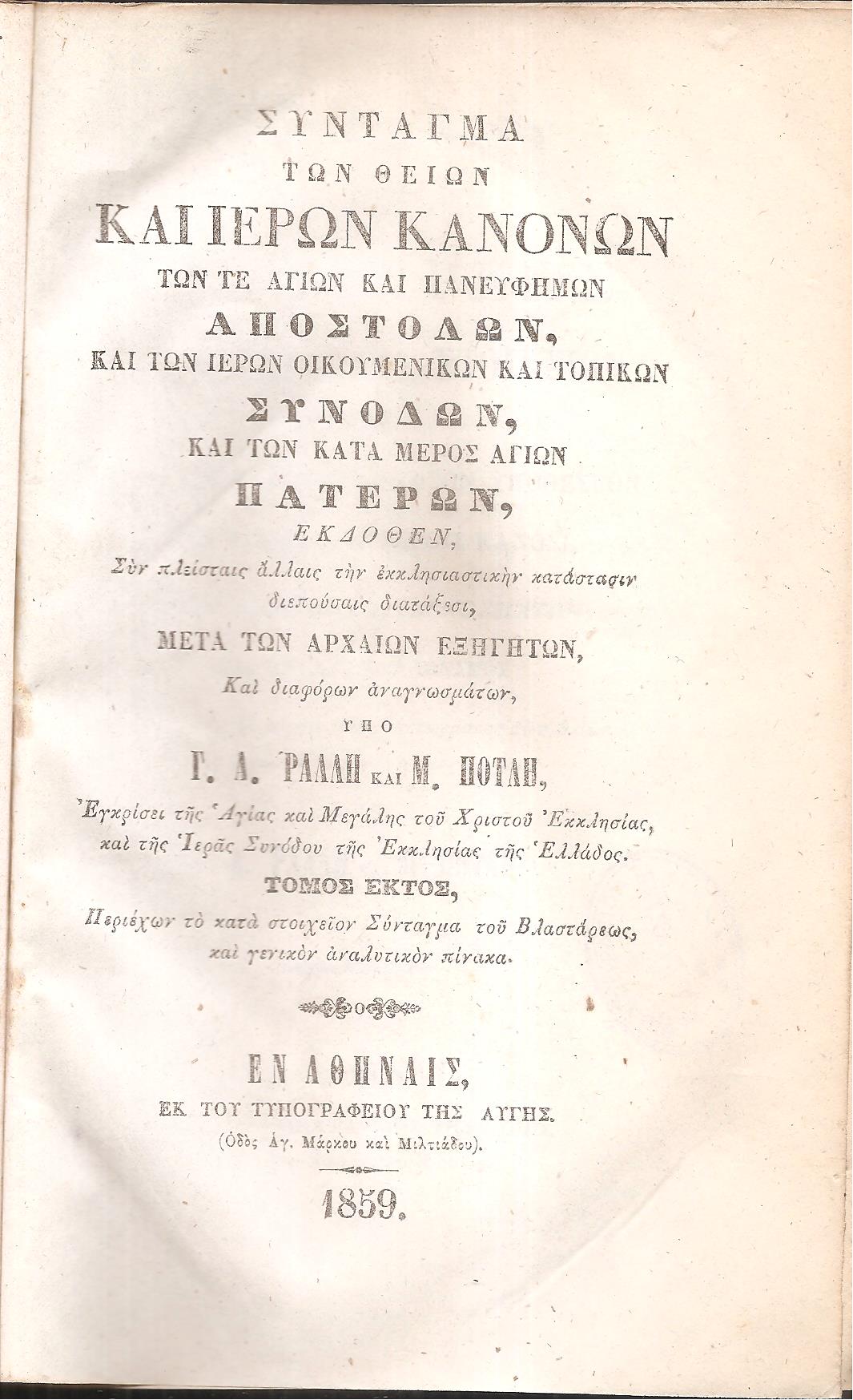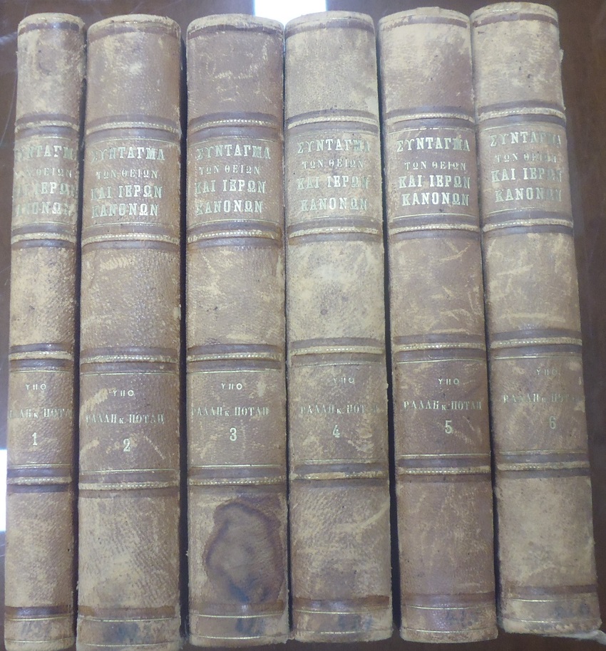 ΡΑΛΛΗΣ Γ.Α. – ΠΟΤΛΗΣ Μ., Σύνταγμα των θείων και ιερών κανόνων των τε Αγίων και Πανευφήμων Αποστόλων, και των Ιερών και Οικουμενικών και τοπικών Συνόδων, και των κατά μέρος Αγίων Πατέρων. Εκδοθέν, συν πλείσταις άλλαις την εκκλησιαστικήν κατάστασιν διεπούσαις διατάξεσι, μετά των αρχαίων εξηγητών, και διαφόρων αναγνωσμάτων. Τόμοι 6. Αθήνησιν 1852-1859, 8ο, σελ. ιθ΄+403+732+η΄+655+η΄+640+ιστ΄+638+ι΄+620 (δερμάτινη βιβλιοδεσία εποχής)