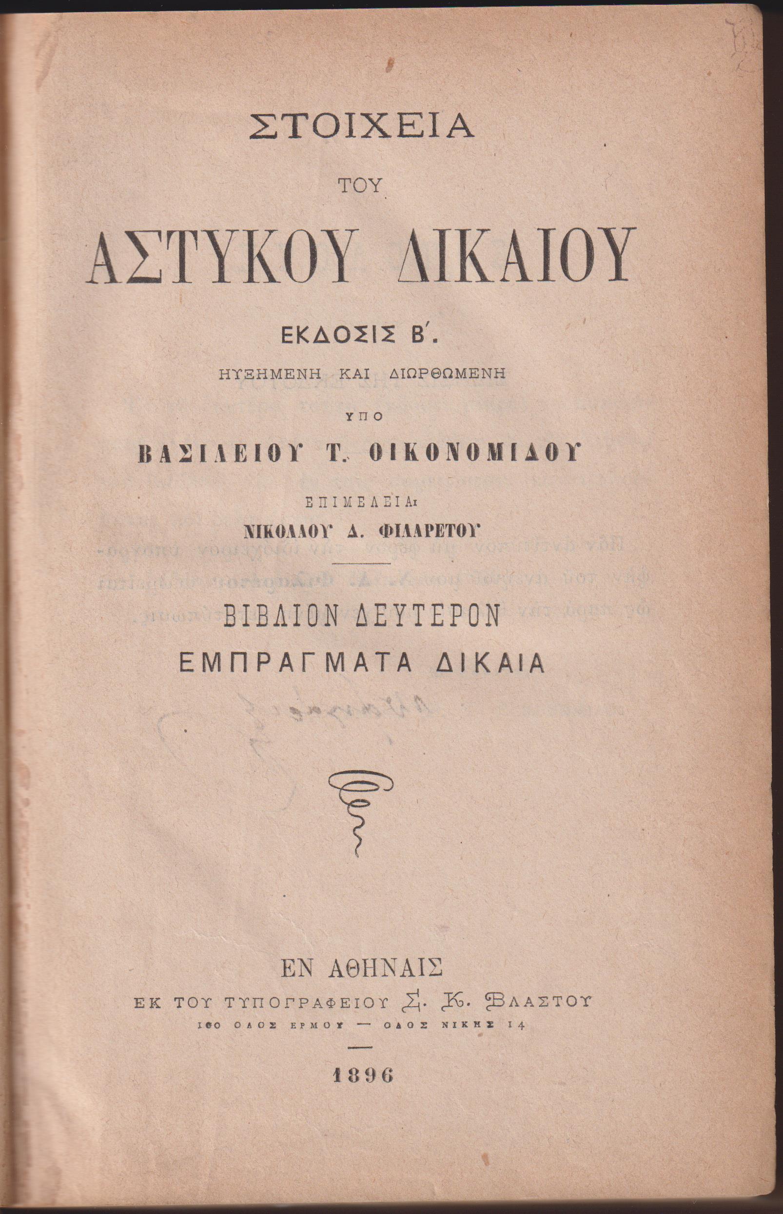 ΟΙΚΟΝΟΜΙΔΗΣ ΒΑΣΙΛΕΙΟΣ Τ., Στοιχεία του Αστυκού Δικαίου, βιβλίον πρώτον Γενικαί Αρχαί,  Έκδοσις B΄ Ηυξημένη και διωρθωμένη. Επιμελεία Νικολάου Δ. Φιλαρέτου. Εν Αθήναις 1893, ΕΚ ΤΟΥ ΤΥΠΟΓΡΑΦΕΙΟΥ ΑΛΕΞ. ΠΑΠΑΓΕΩΡΓΙΟΥ, 8ο, σελ. η΄+488 [μαζί] ΟΙΚΟΝΟΜΙΔΗΣ ΒΑΣΙΛΕΙΟΣ Τ., Στοιχεία του Αστυκού Δικαίου, βιβλίον δεύτερον Εμπράγματα Δίκαια,  Έκδοσις B΄ Ηυξημένη και διωρθωμένη. Επιμελεία Νικολάου Δ. Φιλαρέτου. Εν Αθήναις 1896, ΕΚ ΤΟΥ ΤΥΠΟΓΡΑΦΕΙΟΥ Σ. Κ. ΒΛΑΣΤΟΥ, 8ο, σελ. η΄+583 (Ο πρώτος τόμος έχει πολύ ταλαιπωρημένη βιβλιοδεσία και λείπει η ράχη, αποκολλημένες μερικές σελίδες. Στον δεύτερο τόμο αποκολλημένο ένα μέρος της ράχης ΗΛΙΟΥ-ΠΟΛΕΜΗ αρ. 1893.781 και ΗΛΙΟΥ-ΠΟΛΕΜΗ αρ. 1896.965)