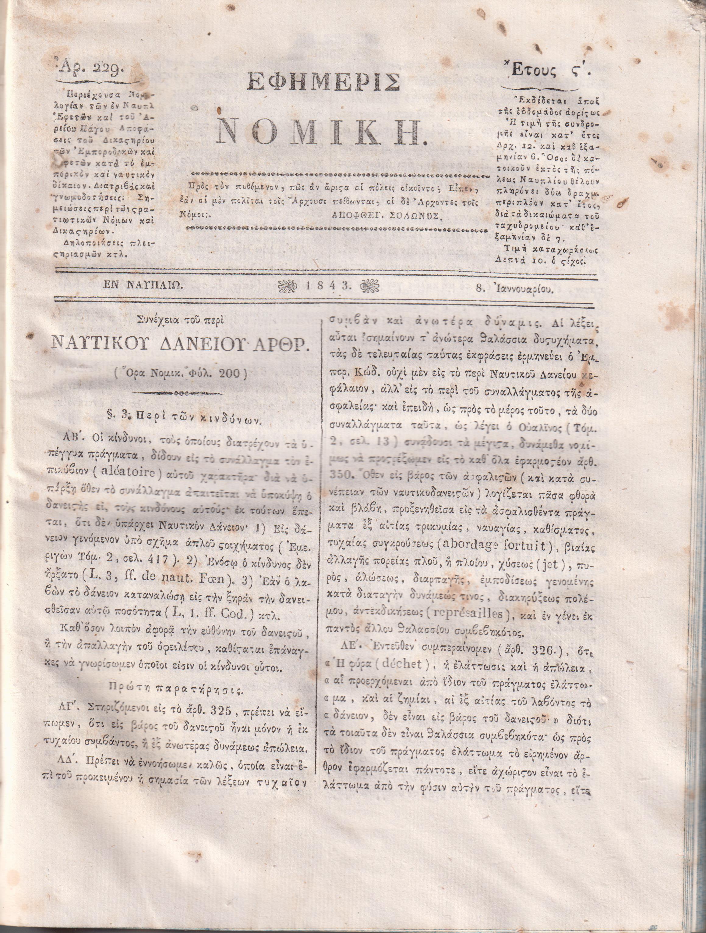 ΕΦΗΜΕΡΙΣ ΝΟΜΙΚΗ 1842-1843, ΄Ετη Ε΄-ΣΤ΄ , Περιέχουσα Νομολογίαν των εν Ναυπλίω Εφετών, και του Αρείου Πάγου. Αποφάσεις του Δικαστηρίου των Εμποροδικών και Εφετών κατά το εμπορικόν και ναυτικόν δίκαιον. Διατριβάς και γνωμοδοτήσεις. Σημειώσεις περί των Στρατιωτικών Νόμων και Δικαστηρίων. Δηλοποιήσεις πλειστηριασμού. Εκδίδεται άπαξ της εβδομάδος αορίστως. Εν Ναυπλίω 1842-1843, 4ο[19Χ26εκ.] σελ. 2639-2998+ΣΤ΄+[2999]-3356+Ζ΄. (΄Ετος Ε΄[1842] αρ. 184[8 Ιανουαρίου 1842] έως αρ. 228[8 Δεκεμβρίου 1842], σελ. 2639-2998+ΣΤ΄[Πίναξ αλφαβητικός και αναλυτικός]. ΄Ετος ΣΤ΄[1843], τεύχη αρ. 229[8 Ιανουαρίου 1843] έως αρ. 273[8 Δεκεμβρίου 1843], σελ. 2999-3356+Ζ΄[Πίναξ αλφαβητικός και αναλυτικός]. Τα δύο έτη (Ε΄+ΣΤ΄) δεμένα σένα τόμο, βιβλιοδεσία εποχής ταλαιπωρημένη, αποκολλημένη η ράχη και τα καπάκια χαλαρά, οι σελίδες 2639-2642 είναι προβληματικές, λείπει στην επάνω εσωτερική γωνία κομμάτι 2Χ7,5 εκ, κάθετα που εκτός από τα περιθώρια επηρεάζει ελαφρώς και το κείμενο, έχει γίνει συντήρηση παλαιότερα)