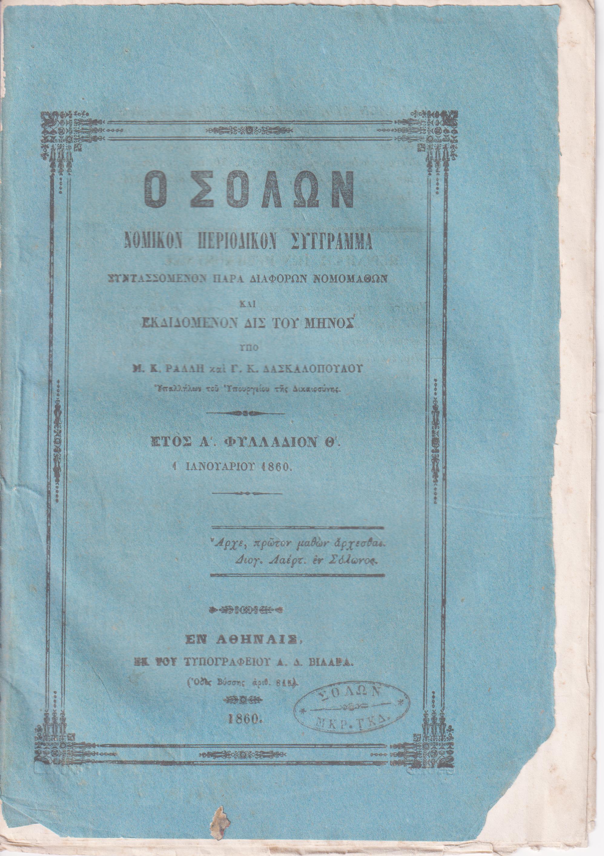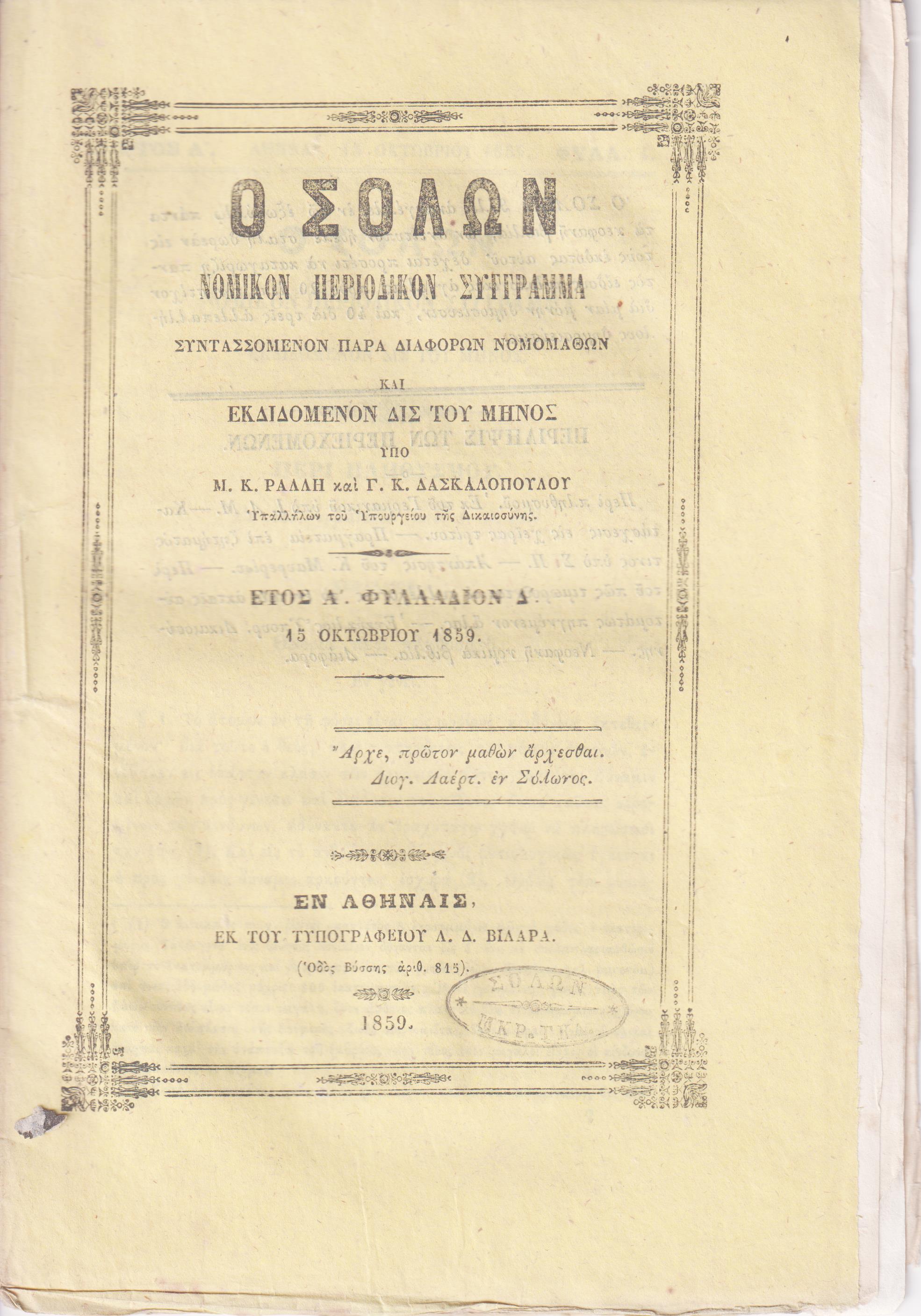 ΣΟΛΩΝ [Ο] 1859-1860, Νομικόν περιοδικόν σύγγραμμα συντασσόμενον παρά διαφόρων Νομομαθών και εκδιδόμενον δις του μηνός υπό Μ. Κ. ΡΑΛΛΗ και Γ. Κ. ΔΑΣΚΑΛΟΠΟΥΛΟΥ . Εν Αθήναις, ΕΚ ΤΟΥ ΤΥΠΟΓΡΑΦΕΙΟΥ Α. Δ. ΒΙΛΑΡΑ, 1859-1860, 8ο (Διαθέσιμα τα τεύχη: ΄Ετος Α΄, φυλλάδιον Β΄[15/9/1859], σελ. 33-64, φυλλ. Γ΄[1/10/1859], σ. 65-96, φυλλ. Δ΄[15/10/1859], σ. 97-128, φυλλ. Ε΄[1/11/1859], σ. 129-160, φυλλ. ΣΤ΄[15/11/1859], σ. 161-192, φυλλ. Ζ΄[1/12/1859], σ. 193-224, φυλλ. Θ΄ [1/1/1860], σ. 257-280, φυλλ. ΙΑ΄ [1/2/1860], σ. 313-344). ΄Όλα τα τεύχη με τα εξώφυλλά τους, σε καλή κατάσταση. ΄Εκαστο τεύχος € 10,60/7,42