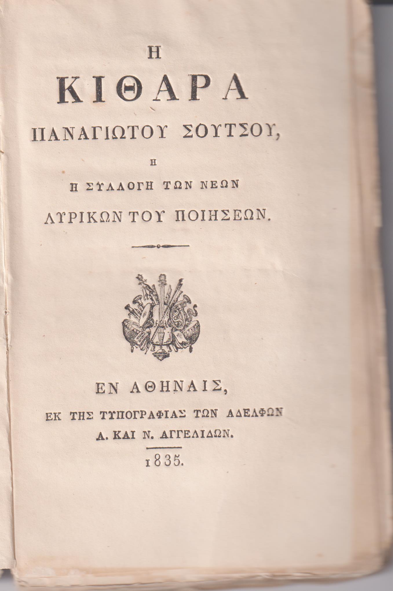 ΣΟΥΤΣΟΣ ΠΑΝΑΓΙΩΤΗΣ, Η Κιθάρα ή Συλλογή των νέων Λυρικών του Ποιήσεων. Εν Αθήναις, ΕΚ ΤΟΥ ΤΥΠΟΓΡΑΦΕΙΟΥ ΤΩΝ ΑΔΕΛΦΩΝ Α. ΚΑΙ Ν. ΑΓΓΕΛΙΔΩΝ, 1835, 12ο, σελ. κδ΄+168 (Α΄έκδοση, αντίτυπο σε αρκετά καλή κατάσταση άδετο, λυτό με το εξώφυλλο, με πολλές βινιέτες εντός κειμένου, ΓΚΙΝΗΣ-ΜΕΞΑΣ αρ. 2493 & ΗΛΙΟΥ-ΠΟΛΕΜΗ αρ. 1835.76)