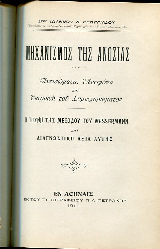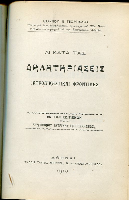 ΓΕΩΡΓΙΑΔΗΣ ΙΩΑΝΝΗΣ Ν., Ο παρθενικός υμήν και ιατροδικαστική σημασία αυτού. Εν Αθήναις 1911, 8ο, σελ. 232 [μαζί δεμ.] ΓΕΩΡΓΙΑΔΗΣ ΙΩΑΝΝΗΣ Ν., Αι κατά τας δηλητηριάσεις ιαρτοδικαστικαί φροντίδες, εκ των κειμένων της Σύγχρονου Ιατρικής Επιθεωρήσεως. Αθήναι 1910, 8ο, σελ. 80+11εικ. [μαζί δεμ.] ΓΕΩΡΓΙΑΔΗΣ ΙΩΑΝΝΗΣ Ν., Μηχανισμός της ανοσίας. Αντισώματα, αντιγόνα και εκτροπή του συμπληρώματος, η τέχνη της μεθόδου του Wasserman και διαγνωστική αξία αυτής. Εν Αθήναις 1911, 8ο, σελ. 114 (ταλαιπωρημένη ιδιωτική βιβλιοδεσία)