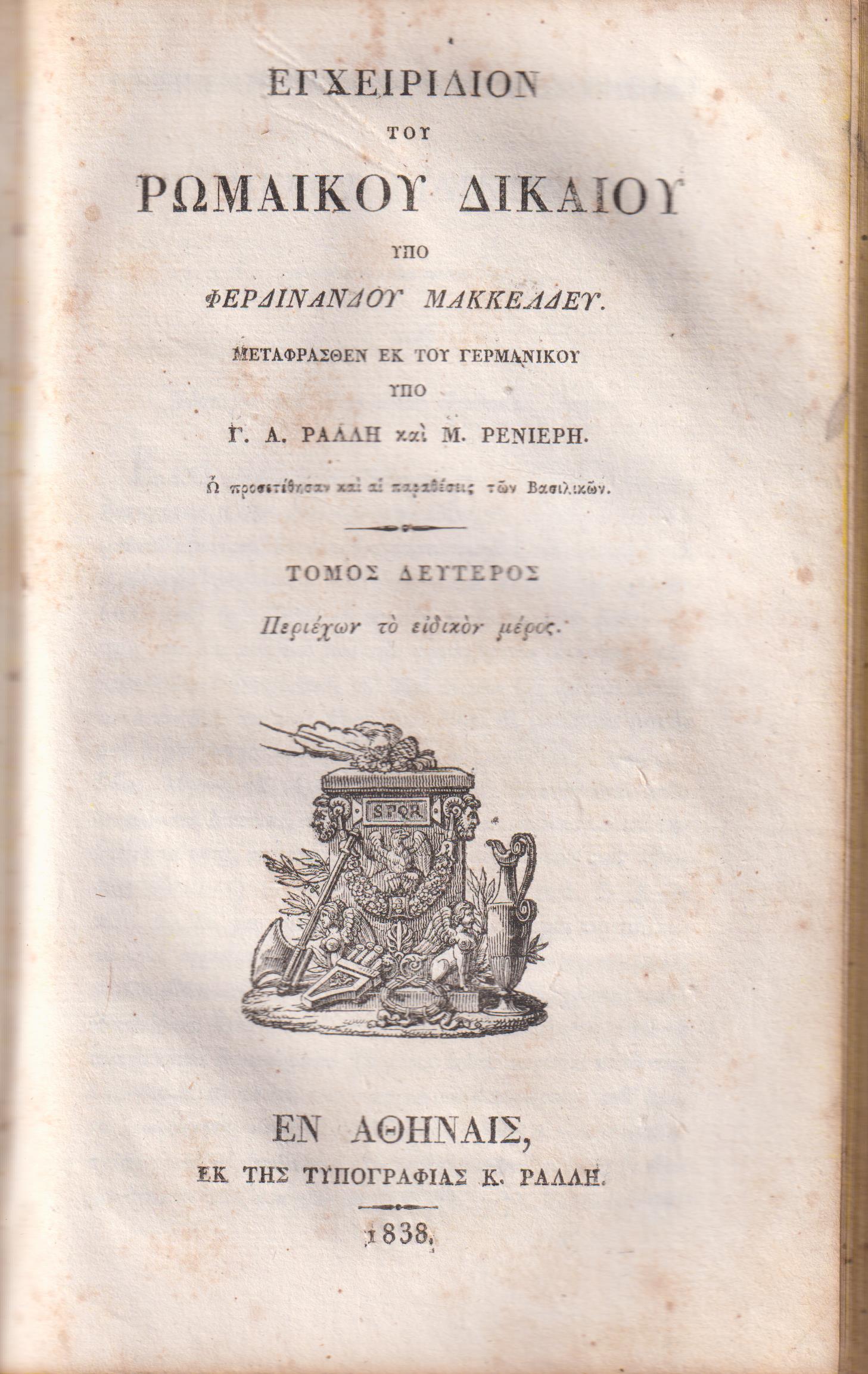 MACKELDEY FERDINAND, Εγχειρίδιον του Ρωμαϊκού Δικαίου, τόμοι Α+Β. Υπό Φερδινάνδου Μακκέλδεϋ, μεταφρασθέν εκ του γερμανικού υπό Γ. Α. Ράλλη και Μ. Ρενιέρη. Ω προσετέθησαν και αι παραθέσεις των Βασιλικών. Τόμος πρώτος περιέχων την εισαγωγήν και το γενικόν μέρος, τόμος δεύτερος περιέχων το ειδικόν μέρος. Εν Αθήναις, ΕΚ ΤΗΣ ΤΥΠΟΓΡΑΦΙΑΣ Κ. ΡΑΛΛΗ, 1838, 8ο, σελ ρπη΄+140+1χ.α.+3λ+775+1λ. (οι δύο τόμοι δεμένοι μαζί, βιβλιοδεσία εποχής, η ράχη ανάποδα και το δέρμα της σπασμένο)