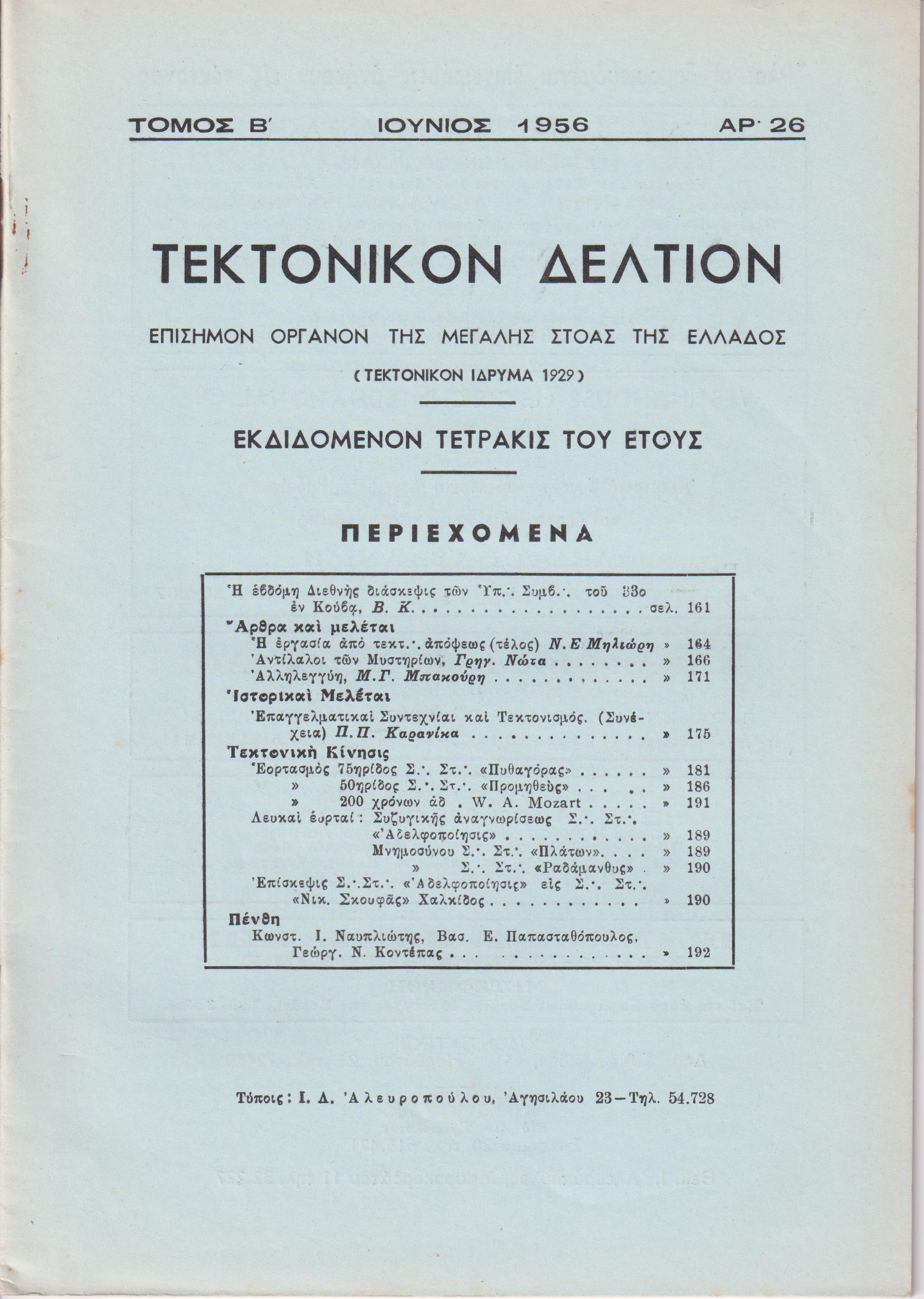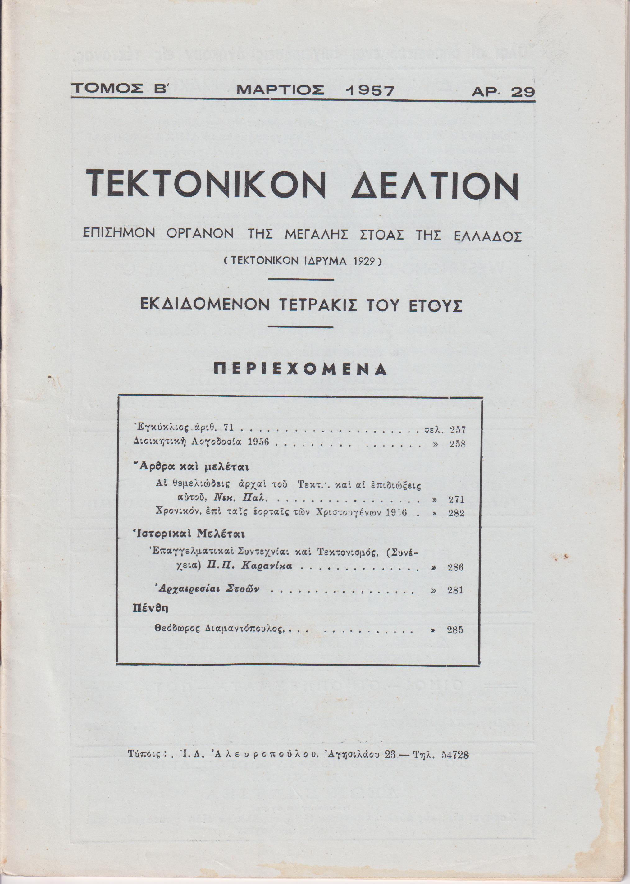 ΤΕΚΤΟΝΙΚΟΝ ΔΕΛΤΙΟΝ, Τόμος Β΄, 1955-1959, Επίσημον Όργανον της Μεγάλης Στοάς της Ελλάδος (Τεκτονικόν ΄Ιδρυμα 1929), εκδίδεται τετράκις του έτους. Υπεύθυνος Συντάκτης : .Α. ΡΑΜΜΟΣ. Επιτροπή ΄Υλης: Θ. ΒΛΗΣΙΔΗΣ, Ι. ΒΑΣΙΛΗΣ, Π. ΓΛΕΖΟΣ. Αθήναι 1955-59, 8ο .΄Ετος 1955, αρ. 21[Μάρτιος 1955, σ. 32], αρ. 22[Ιούνιος 1955, σ. 33-64]. Υπ. Σύντ.: Π. ΧΑΤΖΗΠΕΤΡΟΣ. αρ. 23[Σεπτέμβριος 1955, σ. 65-96], αρ. 24[Δεκέμβριος 1955, σ. 97-128, ΠΛΗΡΕΣ ΕΤΟΣ. ΄Ετος 1956, Επιτροπή ΄Υλης: Θ. ΒΛΗΣΙΔΗΣ, Ν. ΜΑΛΑΓΑΡΔΗΣ, Π. ΓΛΕΖΟΣ. λείπει το 1ο τεύχος αρ.25[Μάρτιος 1956], αρ. 26[Ιούνιος 1956, σ. 161-192], αρ. 27[Σεπτέμβριος 1956, σ. 193-224], αρ. 28[Δεκέμβριος 1956, σ. 225-256. ΄Ετος 1957. Υπ. Σύντ.: Π. ΧΑΤΖΗΠΕΤΡΟΣ. Επιτροπή ΄Υλης: Θ. ΒΛΗΣΙΔΗΣ, Ν. ΠΑΛΑΙΟΛΟΓΟΠΟΥΛΟΣ, Π. ΓΛΕΖΟΣ. αρ.29[Μάρτιος 1957, σ. 257-288], αρ. 30[Ιούνιος 1957, σ. 289-320], αρ. 31[Οκτώβριος 1957, σ. 321-352], αρ. 32[Δεκέμβριος 1957, σ. 353-384, ΠΛΗΡΕΣ ΕΤΟΣ. ΄Ετος 1958, αρ. 33[Μάρτιος 1958, σ. 385-416], αρ. 34[Ιούνιος 1958, σ. 417-448], αρ. 35[Σεπτέμβριος 1958, σ. 449-480], αρ. 36[Δεκέμβριος 1958, σ. 481-512], ΠΛΗΡΕΣ ΕΤΟΣ. ΄Ετος 1959, αρ. 37[Μάρτιος 1959, σ. 513-544], αρ. 38[Ιούνιος 1959, σελ. 545-576]. Επιτροπή ΄Υλης: Ν. ΠΑΛΑΙΟΛΟΓΟΠΟΥΛΟΣ, Π. ΓΛΕΖΟΣ, Π. ΣΤΕΦΑΝΟΠΟΥΛΟΣ, αρ. 39[Σεπτέμβριος 1959, σελ. 577-608], αρ. 40[Δεκέμβριος 1959, σ. 609-640], ΠΛΗΡΕΣ ΕΤΟΣ. . Σύνολον 19 τεύχη με τα εξώφυλλά τους
