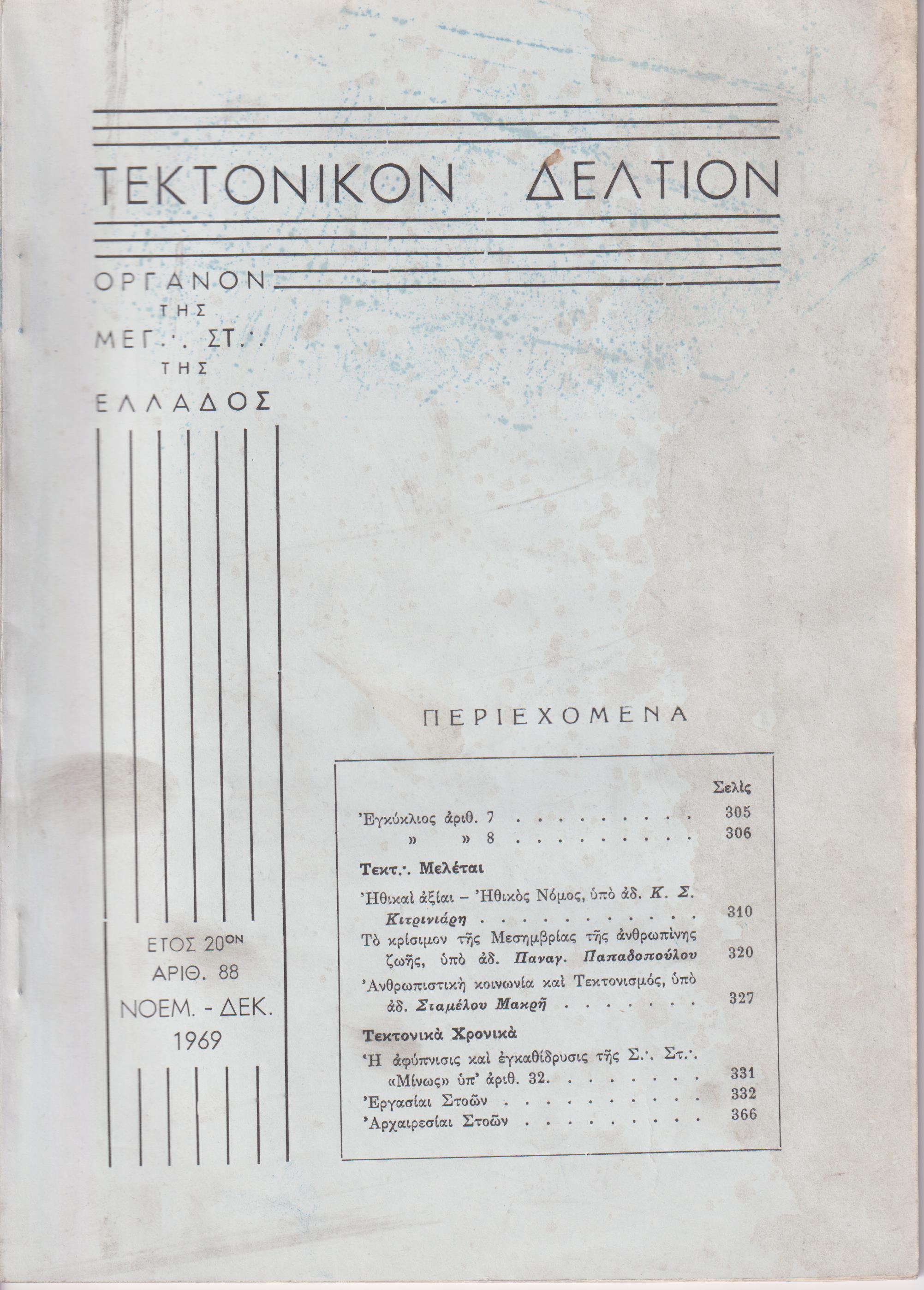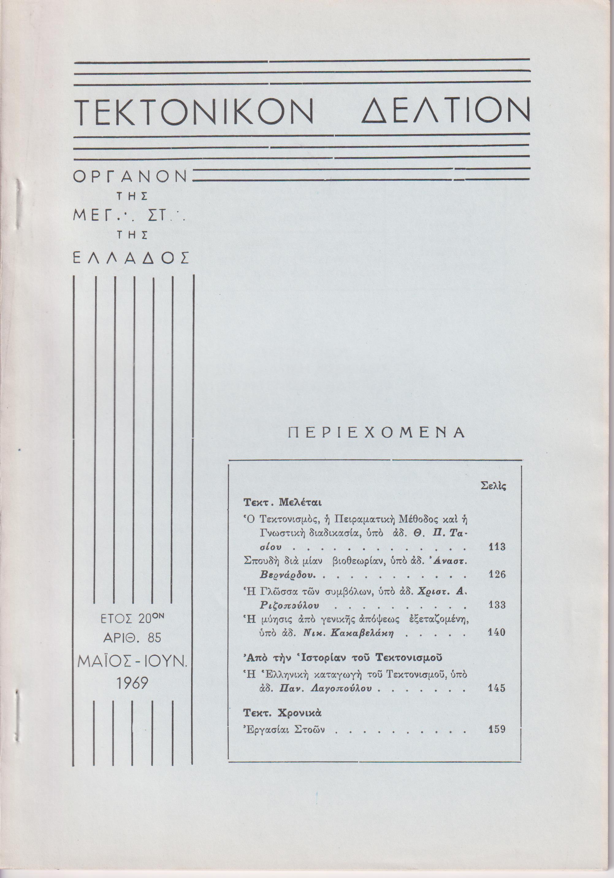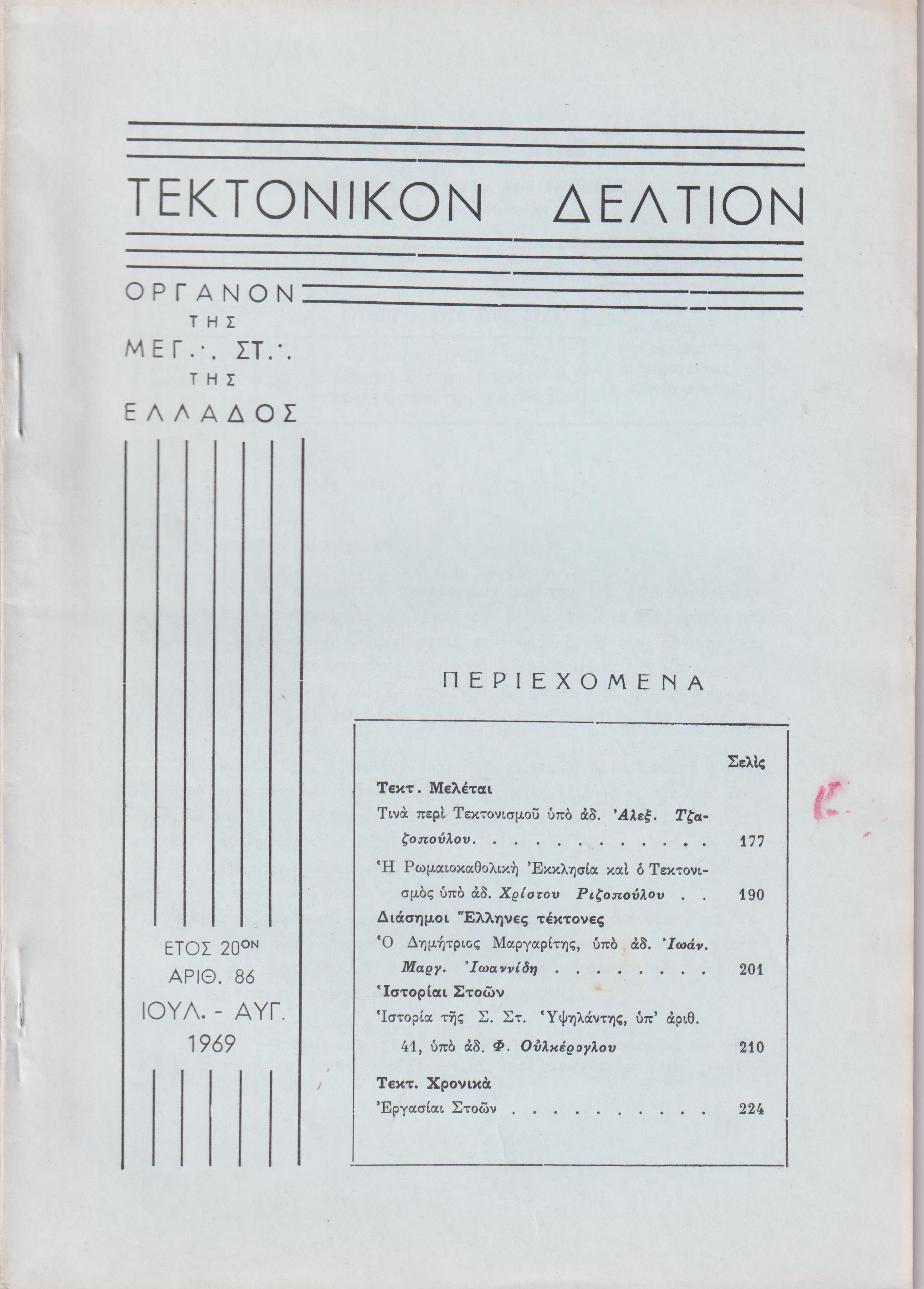 ΤΕΚΤΟΝΙΚΟΝ ΔΕΛΤΙΟΝ, 1969, έτος 20ον, ΄Οργανον της Μεγάλης Στοάς της Ελλάδος. Υπεύθυνος:   Ε. ΜΑΚΡΥΜΙΧΑΛΟΣ. Συντακτ. Επιτροπή: Π. Γ. ΚΡΗΤΙΚΟΣ, Ν. ΜΗΛΙΩΡΗΣ, Φ. ΦΑΛΜΠΟΣ, Α. ΖΕΡΒΟΥΔΑΚΗΣ, Ξ. ΧΑΤΖΗΣΑΡΑΝΤΟΣ. Αθήναι 1969, 8ο, σελ. 376,  αρ. 83-84[Ιαν.-Απρίλ. 1969, σελ. 112], αρ. 85[Μάϊος-Ιούν. 1969, σελ. 113-176], αρ. 86[Ιούλ.-Αύγ. 1969, σελ. 177-240], αρ. 87[Σεπτ.-Οκτ. 1969, σελ. 241-304], αρ. 88[Νοέμ.-Δεκ. 1969, σελ. 305-376]. ΠΛΗΡΕΣ ΕΤΟΣ.  Σύνολον 5 τεύχη με τα εξώφυλλά τους.