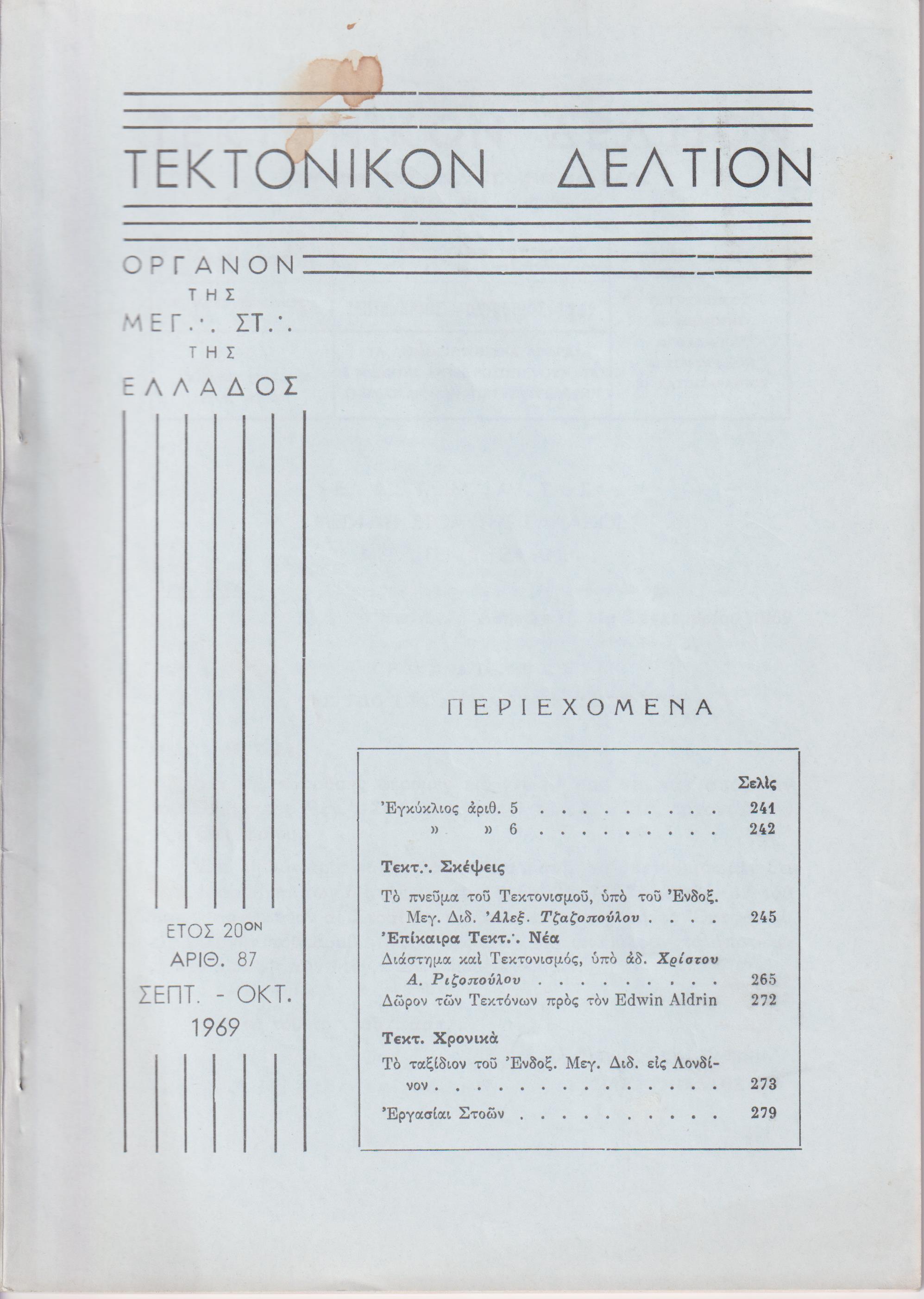 ΤΕΚΤΟΝΙΚΟΝ ΔΕΛΤΙΟΝ, 1969, έτος 20ον,΄Οργανον της Μεγάλης Στοάς της Ελλάδος