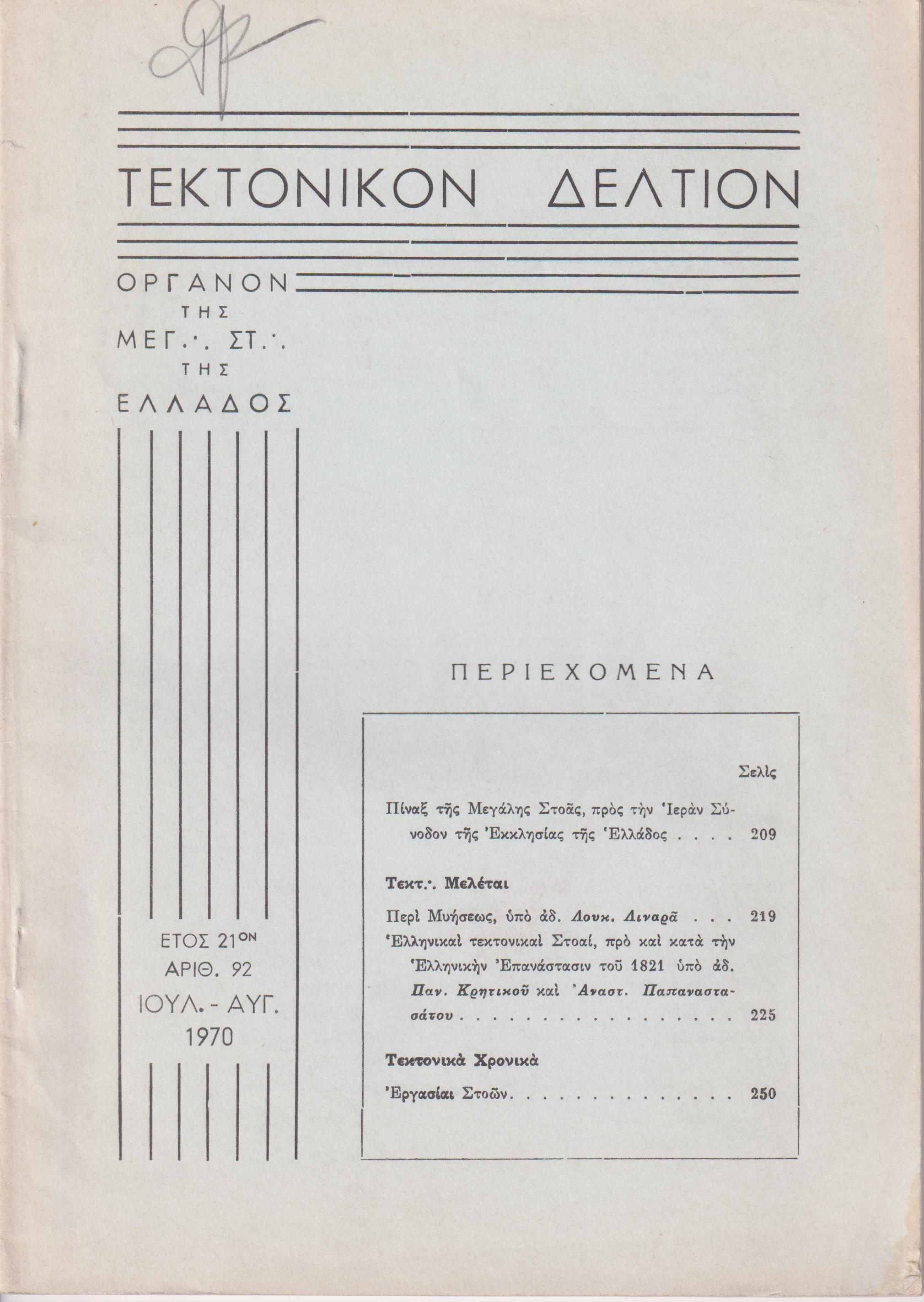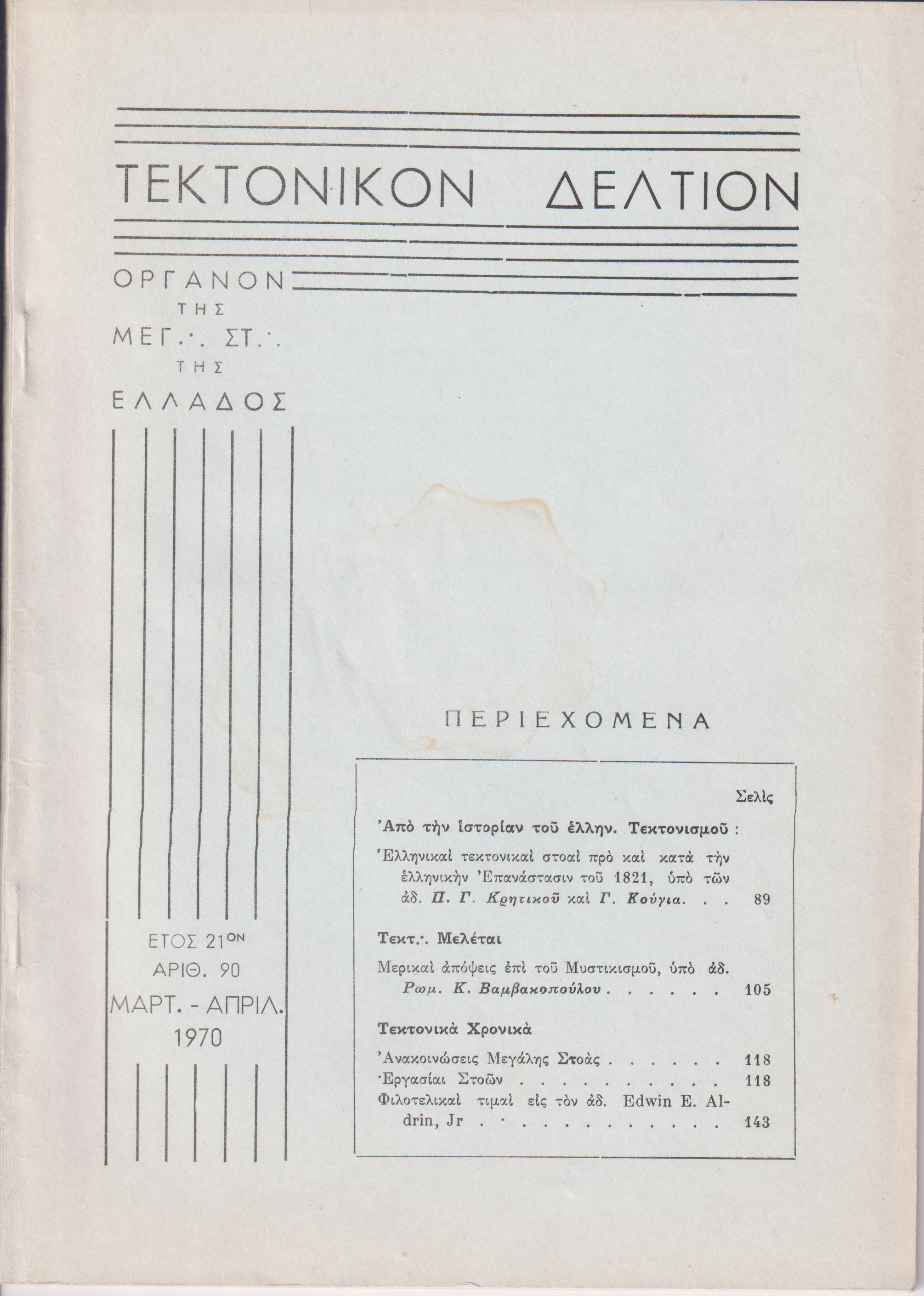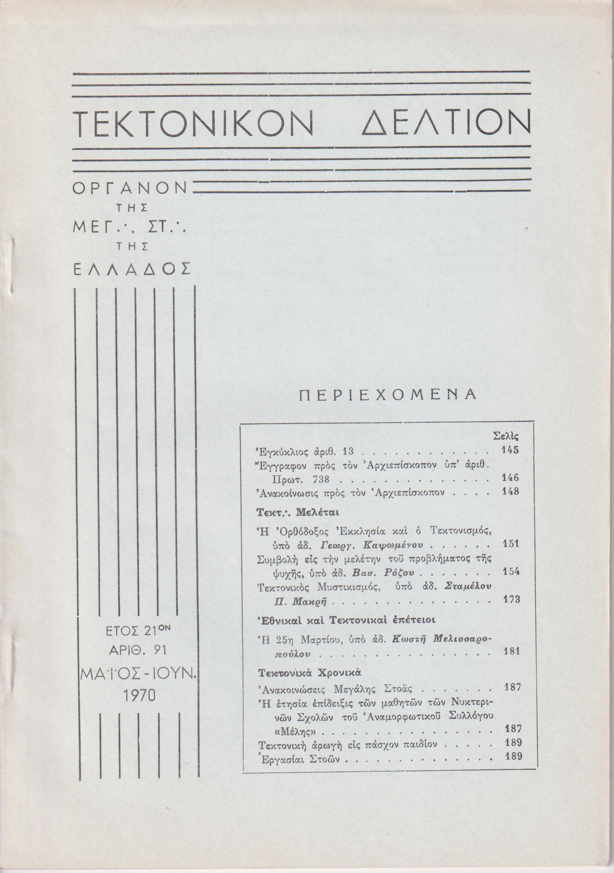 ΤΕΚΤΟΝΙΚΟΝ ΔΕΛΤΙΟΝ, 1970, έτος 21ον, ΄Οργανον της Μεγάλης Στοάς της Ελλάδος. Υπεύθυνος:  Ε. ΜΑΚΡΥΜΙΧΑΛΟΣ. Συντακτ. Επιτροπή: Π. Γ. ΚΡΗΤΙΚΟΣ, Ν. ΜΗΛΙΩΡΗΣ, Φ. ΦΑΛΜΠΟΣ, Α. ΖΕΡΒΟΥΔΑΚΗΣ, Ξ. ΧΑΤΖΗΣΑΡΑΝΤΟΣ. Αθήναι 1970, 8ο, σελ. 408,  αρ.89[Ιαν.-Φεβρ. 1970, σελ. 88], αρ. 90[Μάρτ.-Απρίλ. 1970, σελ. 88-144], αρ. 91[Μάϊος-Ιούν. 1970, σελ. 145-208], αρ. 92[Ιούλ.-Αύγ. 1970, σελ. 209-272], αρ. 93[Σεπτ.-Οκτ. 1970, σελ. 273-329], αρ. 94[Νοέμ..-Δεκ. 1970, σελ. 329-408]. ΠΛΗΡΕΣ ΕΤΟΣ. Σύνολον 6 τεύχη με τα εξώφυλλά τους.