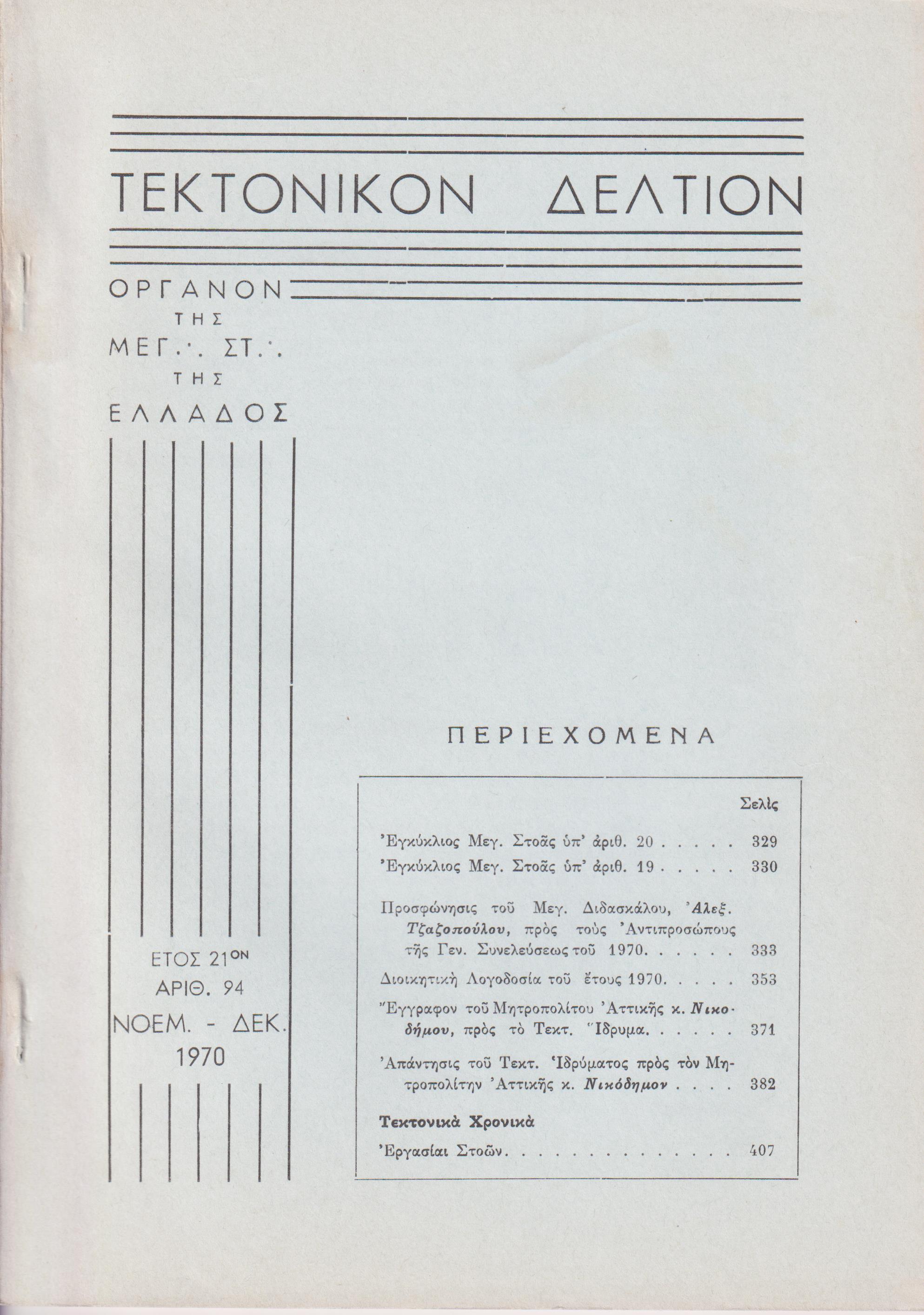 ΤΕΚΤΟΝΙΚΟΝ ΔΕΛΤΙΟΝ, 1970, έτος 21ον, ΄Οργανον της Μεγάλης Στοάς της Ελλάδος