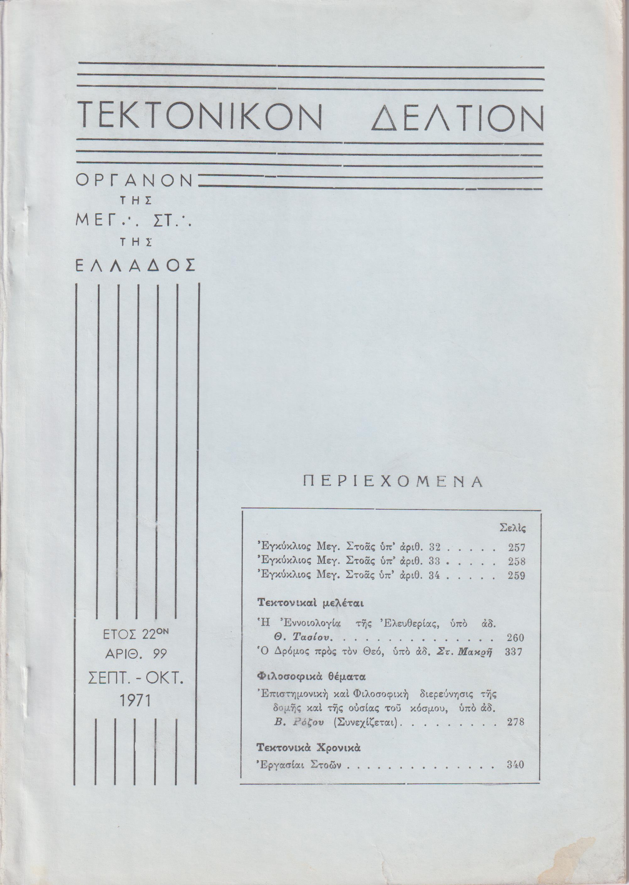 ΤΕΚΤΟΝΙΚΟΝ ΔΕΛΤΙΟΝ, 1971, έτος 22ον,΄Οργανον της Μεγάλης Στοάς της Ελλάδος