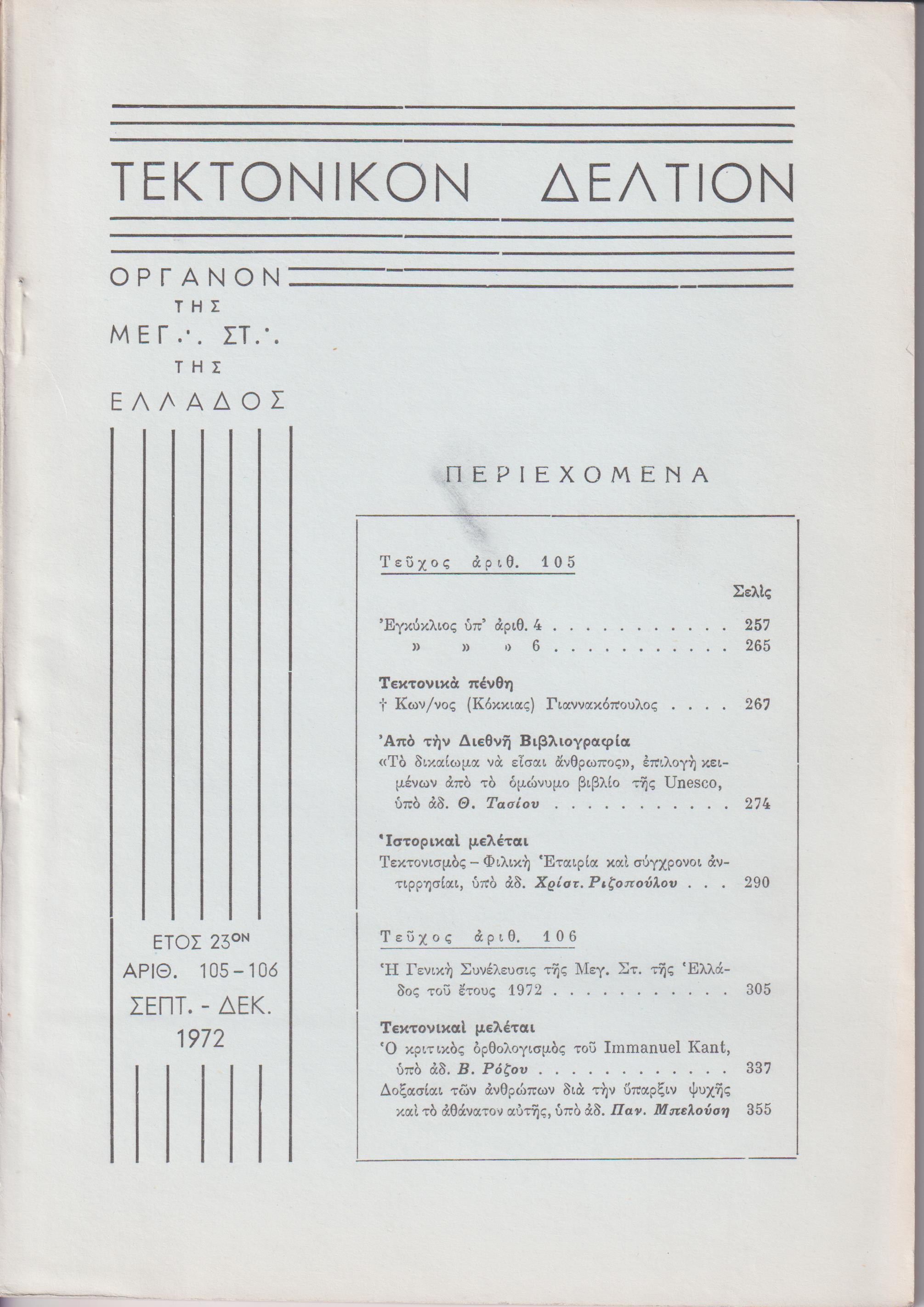 ΤΕΚΤΟΝΙΚΟΝ ΔΕΛΤΙΟΝ, 1972, έτος 23ον, ΄Οργανον της Μεγάλης Στοάς της Ελλάδος. Υπεύθυνος: Ε. ΜΑΚΡΥΜΙΧΑΛΟΣ. Συντακτ. Επιτροπή: Π. Γ. ΚΡΗΤΙΚΟΣ, Ν. ΜΗΛΙΩΡΗΣ, Φ. ΦΑΛΜΠΟΣ, Α. ΖΕΡΒΟΥΔΑΚΗΣ, Ξ. ΧΑΤΖΗΣΑΡΑΝΤΟΣ. Αθήναι 1972, 8ο, σελ. 381; αρ.103[Μάϊος.-Ιούν. 1972, σελ. 129-192], αρ. 104[Ιούλ.-Αύγ. 1972, σελ. 193-256], αρ. 105-106[Σεπτ.-Δεκ. 1972, σελ. 257-381+1χ.α.]. Λείπουν τα τεύχη 101-102