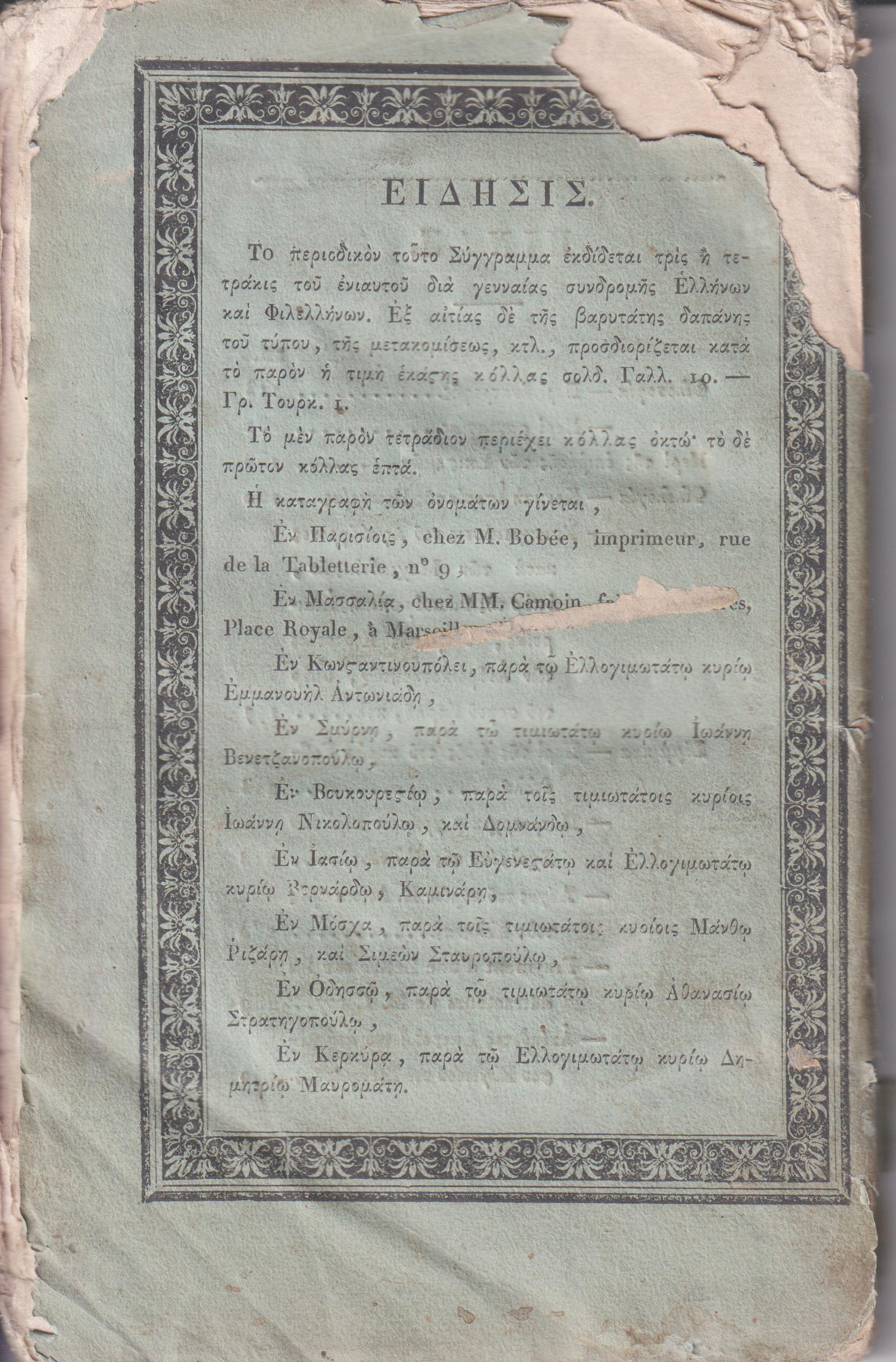 ΜΕΛΙΣΣΑ ή ΕΦΗΜΕΡΙΣ ΕΛΛΗΝΙΚΗ, Τετράδια Α΄& Β΄(μόνο), Εκδιδομένη υπό Σ. Κονδού Κερκυραίου… Εν Παρισίοις 1819-1820, ΕΚ ΤΗΣ ΤΥΠΟΓΡΑΦΙΑΣ ΤΟΥ Α. ΒΟΒΑΙΟΥ,8ο. Τετράδιον Α΄, σελ. φ. 2+η΄+[13]-112 (λείπει το εμπροσθόφυλλο, άκοπα φύλλα από σελ. 25-96). Τετράδιον Β΄, σελ. 113-242 +2χ.α. (η σελίδα τίτλου λείπει; αντίτυπο ταλαιπωρημένο, ίχνη υγρασίας σε όλες τις σελίδες[μονές-ζυγές στο κάτω μέρος)