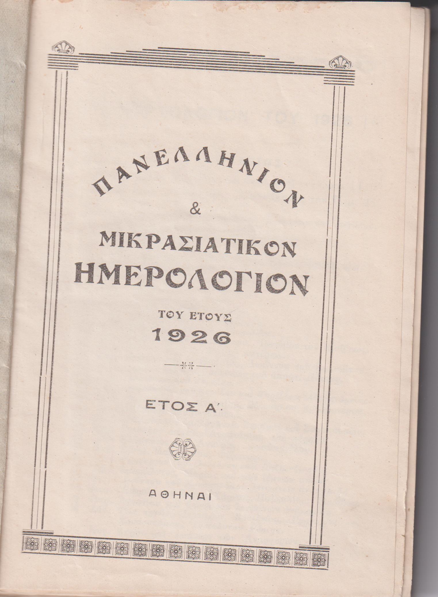 ΠΑΝΕΛΛΗΝΙΟΝ & ΜΙΚΡΑΣΙΑΤΙΚΟΝ ΗΜΕΡΟΛΟΓΙΟΝ ΤΟΥ ΕΤΟΥΣ 1926. ΄Ετος Α΄