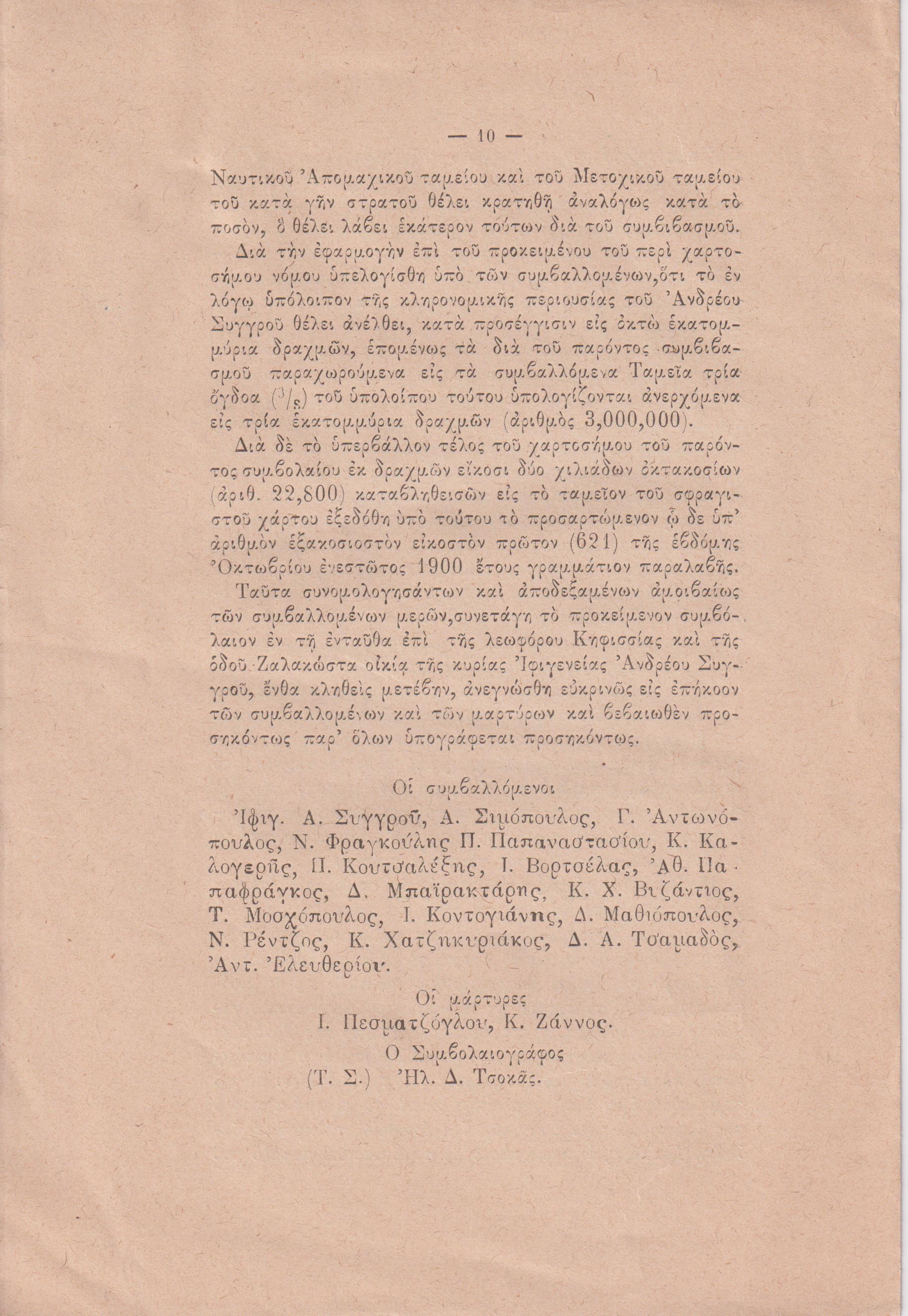 Το προς το Ελληνικόν Δημόσιον δωρητήριον της κυρίας Ιφιγενείας Α. Συγγρού αρ. 12081. Εν Αθήναις 1900, 8ο, σελ. 10+4λ. (πρόκειται για το δεύτερο μέρος της έκδοσης «Η Διαθήκη του Ανδρέου Δ. Συγγρού και το προς το Ελληνικόν Δημόσιον Δωρητήριον της Κυρίας Ιφιγενείας Α. Συγγρού»)