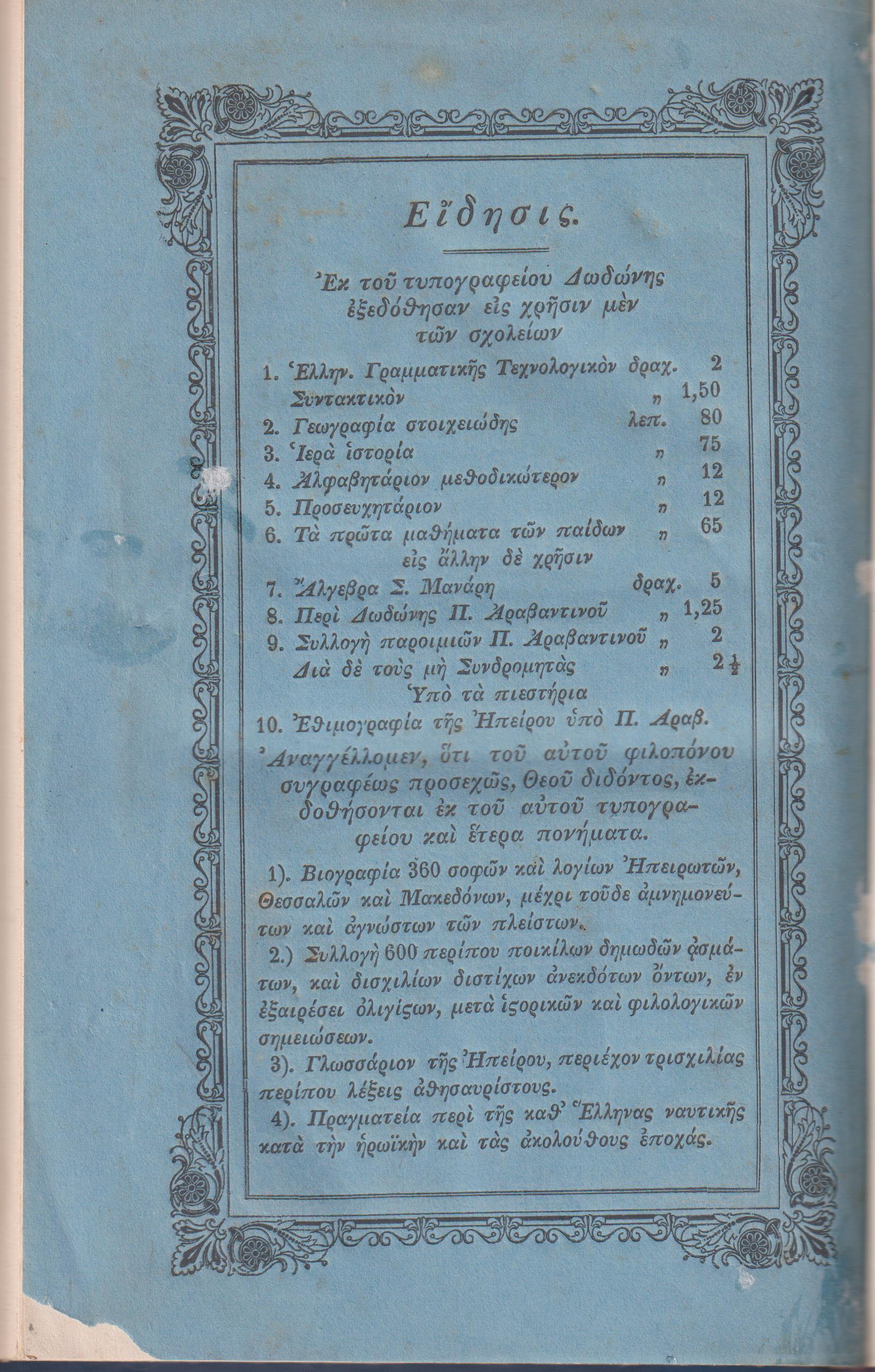 ΑΡΑΒΑΝΤΙΝΟΣ Π., Παροιμιαστήριον ή συλλογή παροιμιών εν χρήσει ουσών παρά τοίς Ηπειρώταις, μετ’ αναπτύξεως της εννοίας αυτών και παραλληλισμού προς τας αρχαίας. Εν Ιωαννίνοις, ΤΥΠΟΙΣ ΔΩΔΩΝΗΣ, 1863, 8o, σελ. ιά+1λ+[15]-183+1λ (αντίτυπο σε αρίστη κατάσταση, νεότερη βιβλιοδεσία με τα εξώφυλλα, δερμάτινη ράχη, χρώμα μπλε, ΗΛΙΟΥ- ΠΟΛΕΜΗ αρ. 1863.447)