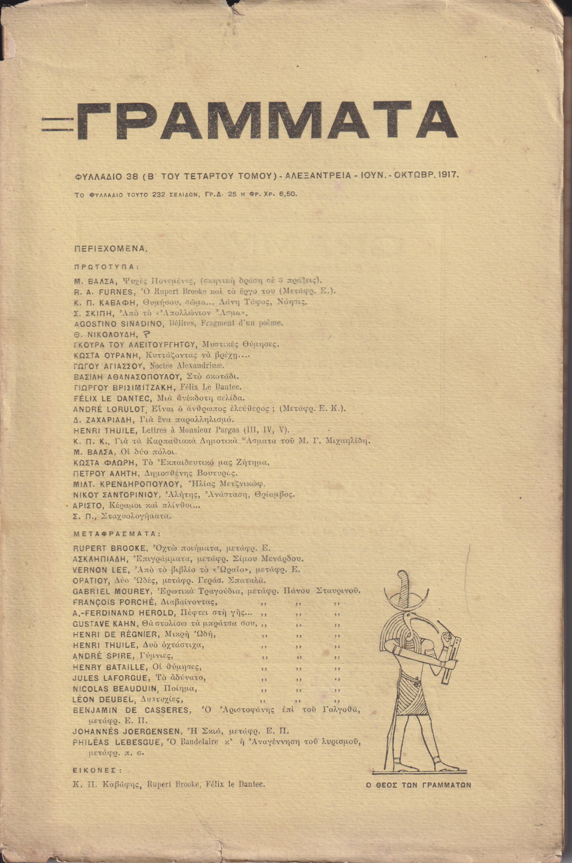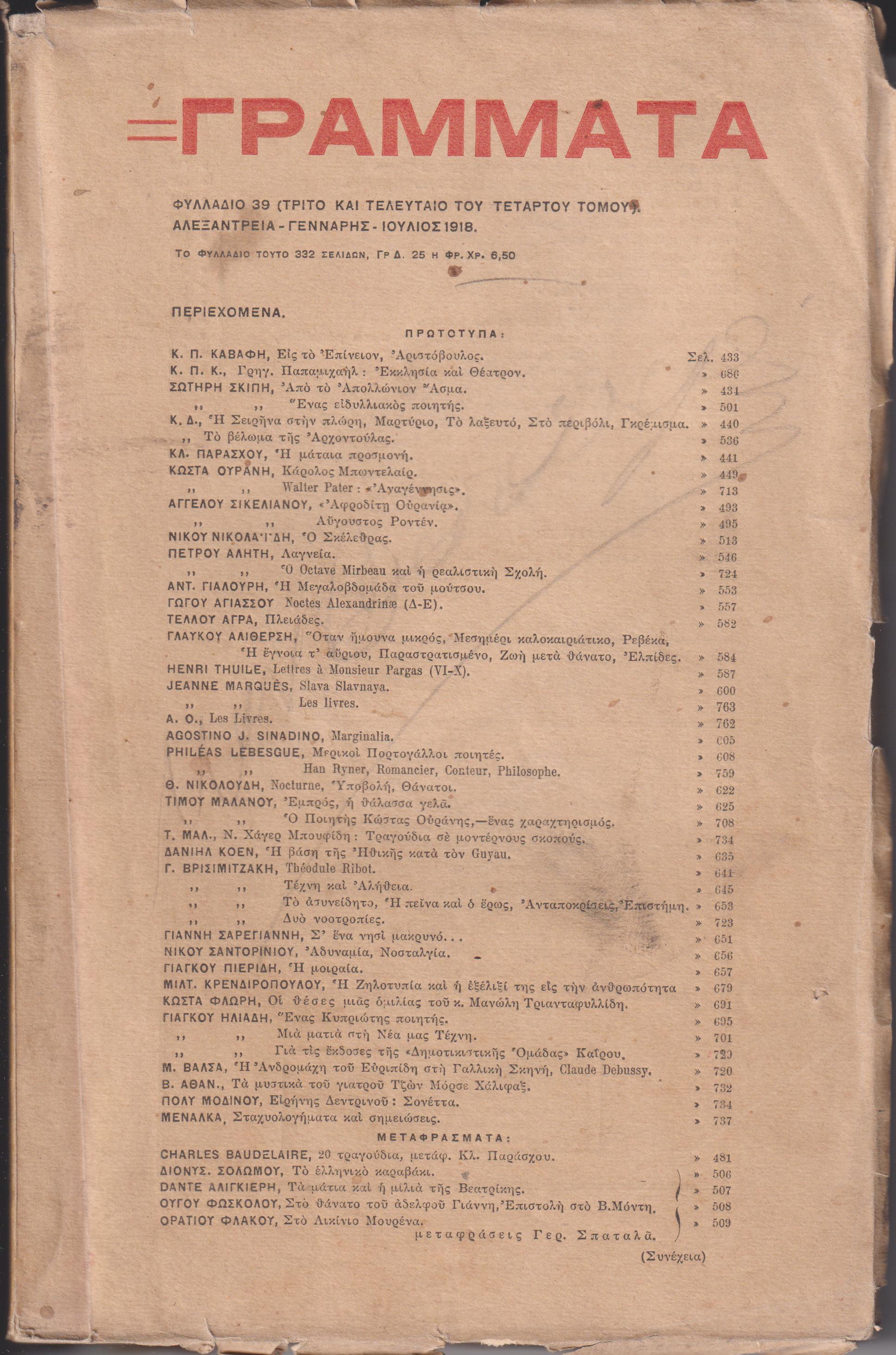 ΓΡΑΜΜΑΤΑ (Αλεξανδρείας), Τόμος Δ΄, φυλλάδια 37, 38, 39, 1917-1918 . Τετράμηνο Λογοτεχνικό Περιοδικό. Εκδότης & Διευθυντής ΣΤΕΦΑΝΟΣ ΠΑΡΓΑΣ . Αλεξάντρεια 1917-1918, 8ο, σελ. 8χ.α.[περιεχόμ.Δ΄τόμου]+στ΄+764+7εικόνες εκτός σελιδαρίθμησης ( Τετάρτου τόμου, Φυλλάδιο 37[Γεννάρης- Μάης 1917, σελ. 8χ.α.[περιεχόμ.Δ΄τόμου]+στ΄+200+φ. 2διαφημ.]. Φυλλάδιο 38[Ιούν.-Οκτώβρ. 1917, σελ. 201-432+3εικόνες+φ.2διαφημίσεις. Προσωπογραφίες [σε φωτογραφια] των : ROBERT BROOK, Κ. Π. ΚΑΒΑΦΗ, FELIX LE DANTE(σκίτσο)]. Φυλλάδιο 39[Γεννάρης-Ιούλιος 1818, σελ. 433-764+8χ.α.(περιεχόμενα Δ΄τόμου)+5εικ. εκτός σελιδαρίθμησης+φ. 4διαφημίσεις. Προσωπογραφίες [σε φωτογραφία] των : ΣΩΤΗΡΗ ΣΚΙΠΗ & PAUL FORT, CHARLES BAUDELAIRE(ζωγραφική και εντός σελιδαρίθμησης,σελ. 465), ΝΙΚΟΥ ΧΑΤΖΑΡΑ, ΝΙΚΟΥ ΝΙΚΟΛΑΪΔΗ, Δ. ΖΑΧΑΡΙΑΔΗ[σκίτσο ΓΙΑΝΝΗ ΚΕΦΑΛΛΗΝΟΥ και εντός σελιδαρίθμησης, σελ. 760], σκίτσο HAN RYNER ]. Δημοσιεύματα των : Κ. Π. ΚΑΒΑΦΗ, Μ. ΠΕΡΙΔΗ, ΓΙΑΝΝΗ ΚΕΦΑΛΛΗΝΟΥ, Α. ΑΠΟΣΤΟΛΟΠΟΥΛΟΥ, ΚΩΣΤΑ ΦΛΩΡΗ, ΜΗΤΣΗ ΚΑΛΑΜΑ, ΠΕΤΡΟΥ ΜΑΓΝΗ, ΚΩΣΤΑ ΟΥΡΑΝΗ, ΚΩΣΤΑ ΠΑΣΑΓΙΑΝΝΗ, ΓΕΡ. ΣΠΑΤΑΛΑ, PHILEAS LEBESQUE, LOUIS FLERI, HAN RYNER, LEON PAUL FARGUE, Μ. ΒΑΛΣΑ, ΣΩΤΗΡΗ ΣΚΙΠΗ, Θ. ΝΙΚΟΛΟΥΔΗ, ΓΚΟΥΡΑ ΤΟΥ ΑΛΕΙΤΟΥΡΓΗΤΟΥ, ΒΑΣΙΛΗ ΑΘΑΝΑΣΟΠΟΥΛΟΥ, Δ. ΖΑΧΑΡΙΑΔΗ, ΓΩΓΟΥ ΑΓΙΑΣΣΟΥ, ΓΙΩΡΓΟΥ ΒΡΙΣΙΜΙΤΖΑΚΗ, ΚΩΣΤΑ ΦΛΩΡΗ, ΠΕΤΡΟΥ ΑΛΗΤΗ, ΜΙΛΤ. ΚΡΕΝΔΗΡΟΠΟΥΛΟΥ, ΝΙΚΟΥ ΣΑΝΤΟΡΙΝΙΟΥ, ΑΓΓΕΛΟΥ ΣΙΚΕΛΙΑΝΟΥ, ΝΙΚΟΥ ΝΙΚΟΛΑΪΔΗ, ΑΝΤ. ΓΙΑΛΟΥΡΗ, AGOSTINO J. SINADINO, ΤΙΜΟΥ ΜΑΛΑΝΟΥ, ΔΑΝΙΗΛ ΚΟΕΝ, Β. ΑΘΑΝ., ΠΟΛΥ ΜΟΔΙΝΟΥ, ΤΕΛΛΟΥ ΑΓΡΑ, ΓΛΑΥΚΟΥ ΑΛΙΘΕΡΣΗ, ΓΙΑΓΚΟΥ ΗΛΙΑΔΗ, Κ.Π.Κ., ΑΙΣ. ΚΥΡΙΑΚΟΠΟΥΛΟΥ, ΚΛ. ΠΑΡΑΣΧΟΥ, ΓΙΑΝΝΗ ΣΑΡΕΓΙΑΝΝΗ, JEAN MOREAS, κ.α. ΠΛΗΡΗΣ ΤΟΜΟΣ σε τρία τεύχη με τα εξώφυλλά τους .